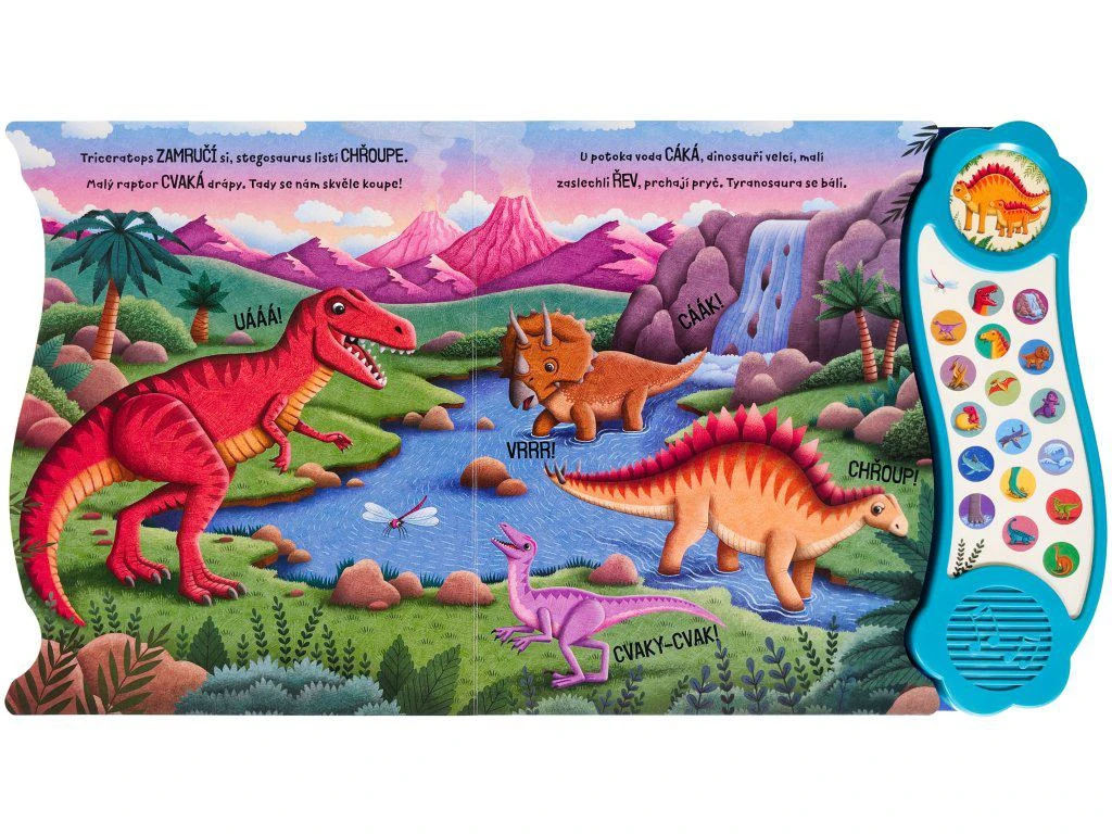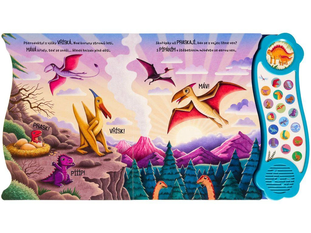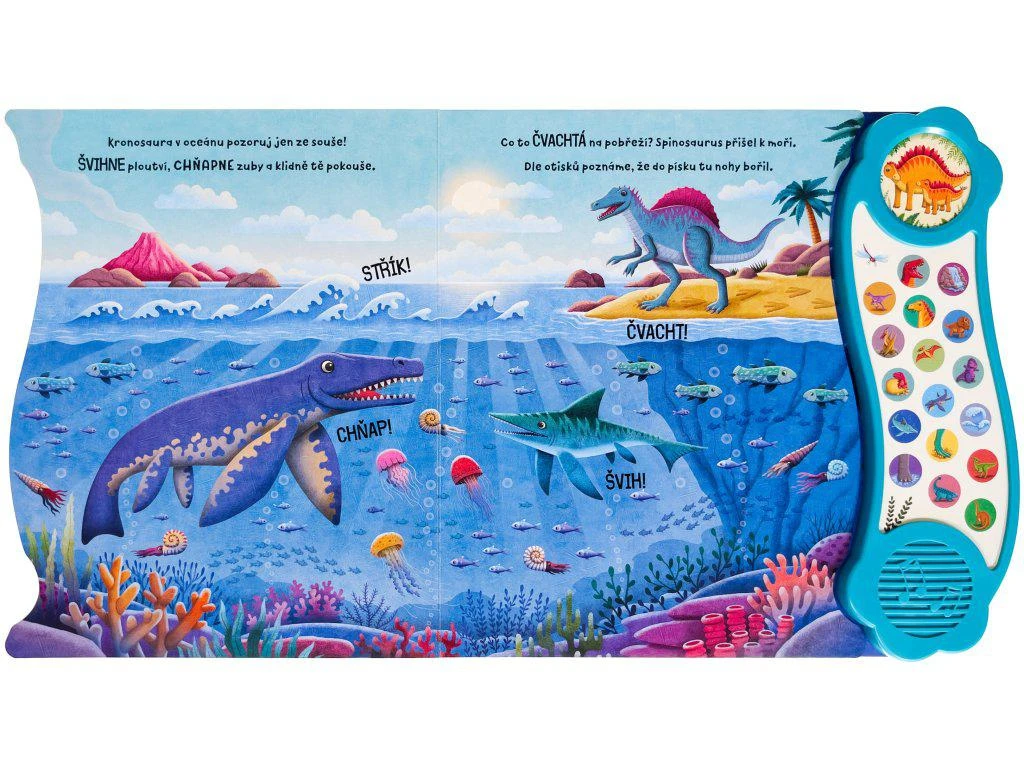 Objavte rušný svet plný dinosaurov s touto úžasnou zvukovou knihou. Nazrite do výšok k pterodaktylom a do hlbín oceánov za prehistorickými morskými jaštermi, na súši stretnete aj neohrozeného T-rexe. Vypočujte si 18 rôznych zvukov a jednu zábavnú pesničku, ktoré vás vtiahnu do fascinujúceho sveta plného vyhynutých tvorov. Táto kniha je ideálna pre malých objaviteľov dinosaurieho sveta, ktorí chcú hravou formou spoznávať tajomstvo prehistorickej éry.