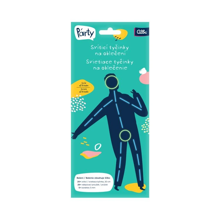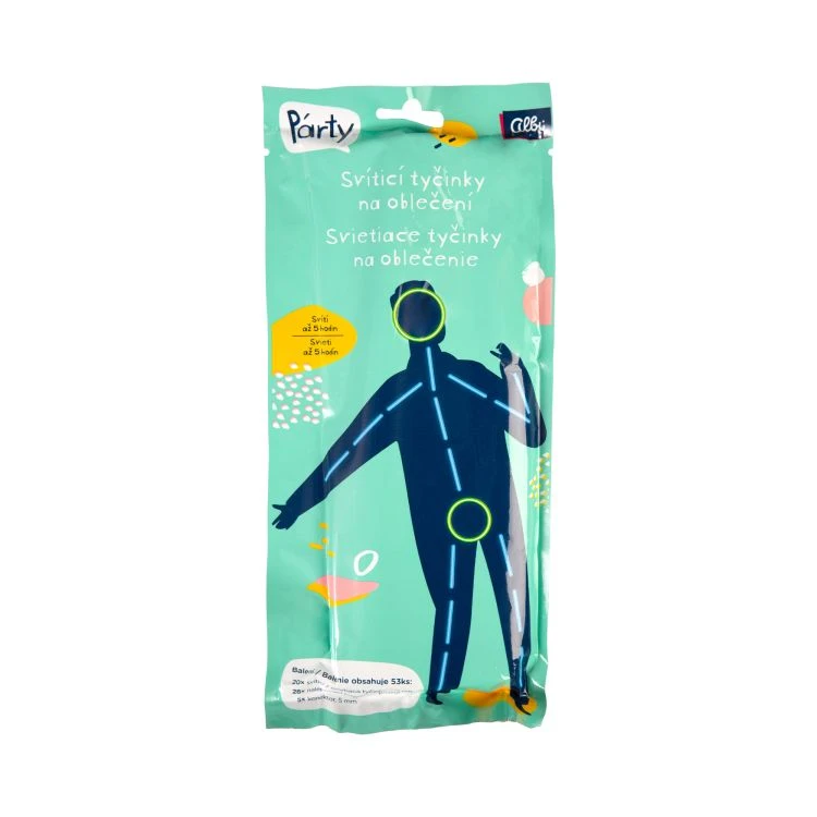 Sada svietiacich tyčiniek na oblečení v prevedení pre chlapcov s ktorou rozžiarite každú párty! Balenie obsahuje tyčinky, ktoré po aktivácii svietia v tme, konektory a nalepovacie prúžky.