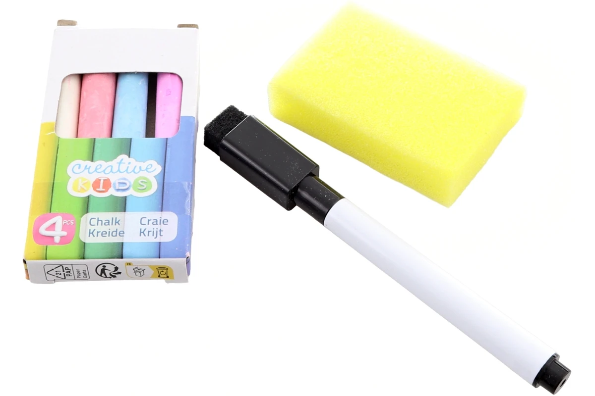 Balenie obsahuje 4 farebné kriedy, mazaciu fixu a hubku.