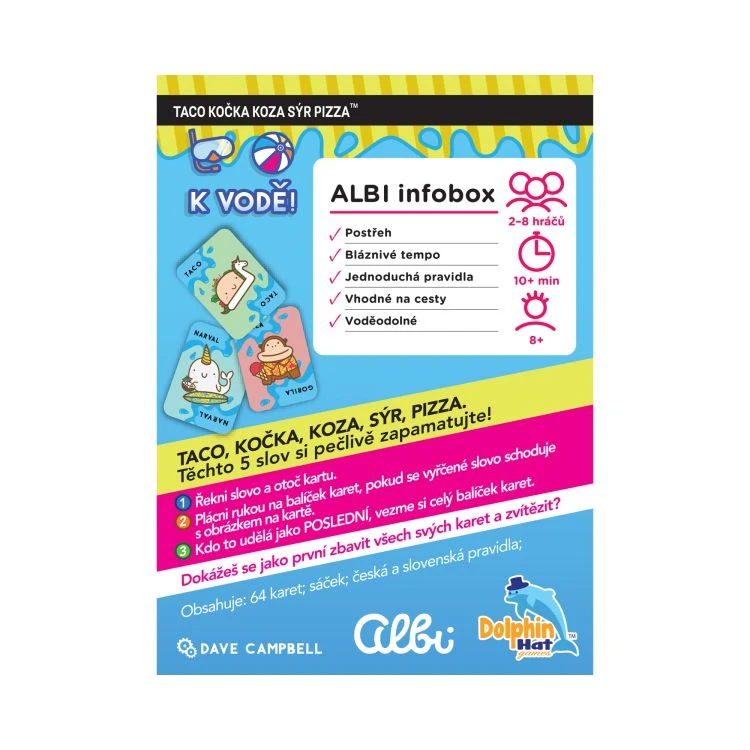 Hra Taco, mačka, koza, syr, pizza - K vode obsahuje: 64 vodeodolných kariet, sťahovacie vrecko, české a slovenské pravidlá.