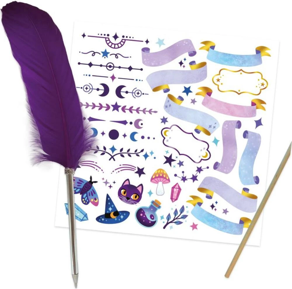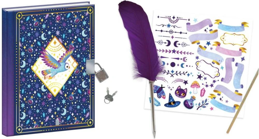 Táto kreatívna súprava obsahuje 96-stránkovú tajnú knihu kúziel s 1 visiacim zámkom a sadou 2 kľúčov. Pekné fialové atramentové pero v tvare pierka a hárok obtlačkov dopĺňa sadu na prispôsobenie vášho diára.