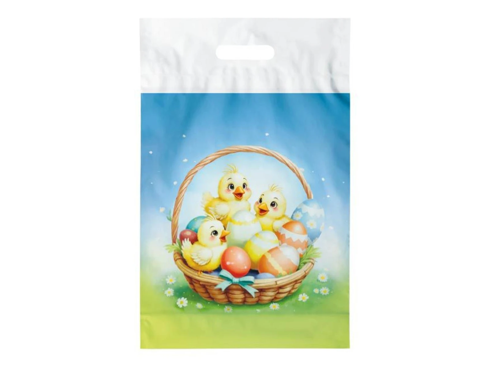 Veľkonočná igelitová taška vo veľkosti L s jarným motívom je ideálna pre balenie darčekov, korbáčov alebo dekorácií. Praktické plastové ucho umožňuje pohodlné nosenie. Veselá potlač vynikne pri každej veľkonočnej nádielke.