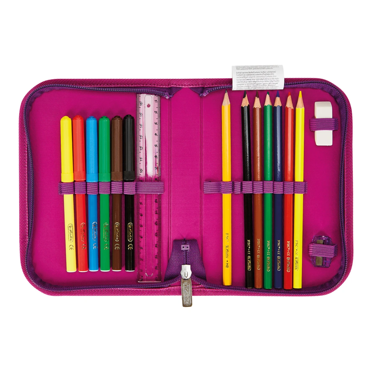 Výbava: peračník 16 dielov: 6 fix, 6 pasteliek s certifikáciou FSC, ceruzka, pravítko, strúhadlo, guma, vrecko na cvičky, okrúhle púzdro.