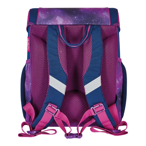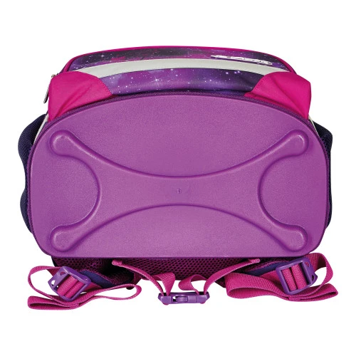 Ergonomicky tvarované a priedušné polstrovanie chrbta, nastaviteľné ramenné popruhy, výškovo nastaviteľný hrudný pás, hlavné vrecko s priestorom pre knihy, bočné vrecká s elastickými pásikmi, predné vrecko na zips, stabilná spodná doska s nožičkami, pohodlná rukoväť, zatváranie Click lock s odrazkou, reflex.