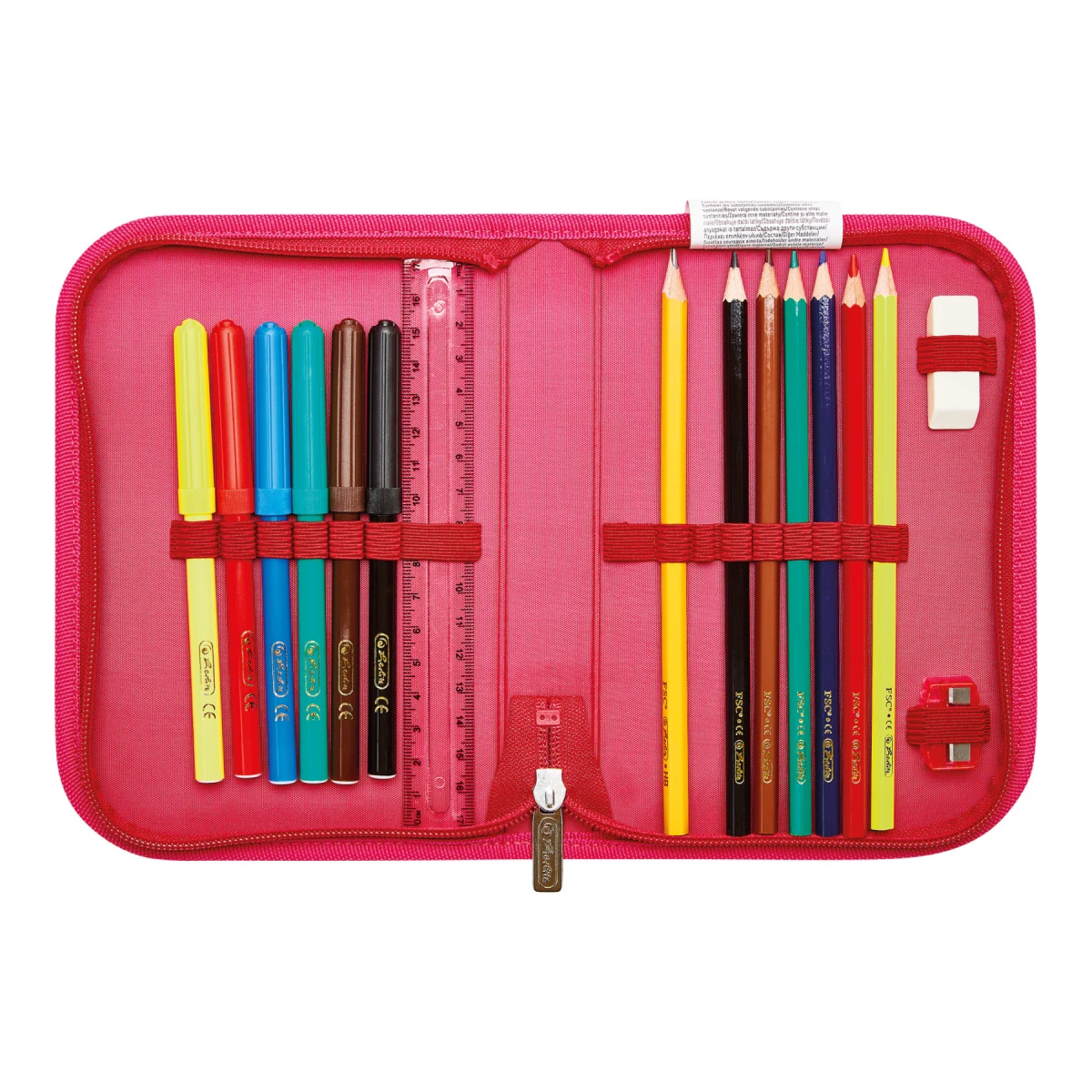 Výbava: peračník 16 dielov: 6 fix, 6 pasteliek, ceruzka, strúhadlo, guma, pravítko, vrecko na cvičky, okrúhle puzdro.
