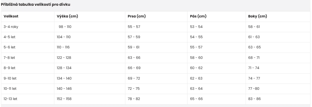 | Veľkosť | 92 / 98 / 104 / 110 / 116 / 128 / 134 / 140 / 146 / 152 / 158 / 164 |