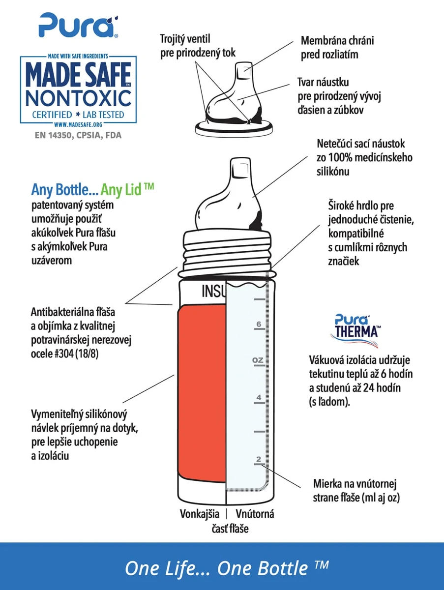 Najbezpečnejšia, najuniverzálnejšia, ľahká a nerozbitná ekologická fľaša, ktorá získala viac ako 35 ocenení. Prvá fľaša na trhu 100% bez plastových častí a jediná fľaša, ktorá získala certifikát NonToxic Certified. Baby Grows… Bottle EvolvesTM - patentovaný systém umožňuje použiť akúkoľvek Pura fľašu s akýmkoľvek Pura uzáverom. Jednoducho tak zmeníte dojčenskú fľašu na fľašu s náustkom, slamkou alebo športovým uzáverom, alebo s použitím tesniaceho disku na pohárik na príkrmy a drobné občerstvenie. Jednu fľašu tak môžete používať roky a zároveň šetríte peniaze aj životné prostredie. Pura používa najkvalitnejšiu technológiu vákuovej tepelnej izolácie. Kvôli silikónovému uzáveru majú fľaše časovo obmedzenú schopnosť udržania teploty obsahu. Nápoj udrží studený do 8 hodín (resp. 24 hodín s ľadom) a teplý do 6 hodín, v závislosti od obsahu, počiatočnej teploty a vonkajšej teploty. Napr. vo fľaši s obsahom 260ml, počiatočnej teplote nápoja 80 °C a vonkajšej teplote mínus 2 °C, má nápoj po 2 hodinách teplotu cca 52 °C a po 6 hodinách cca 27 °C. Pokiaľ chcete udržať teplotu nápoja ešte dlhšie, použite silikónový tesniaci disk Pura. (Predáva sa samostatne). Nepoužívajte na vriace alebo sýtené nápoje. Sila pary resp. bubliniek by mohla vytrysknúť tekutinu cez silikónový uzáver. Nepoužívajte na vriace alebo sýtené nápoje. Sila pary resp. bubliniek by mohla vytrysknúť tekutinu cez silikónový uzáver.