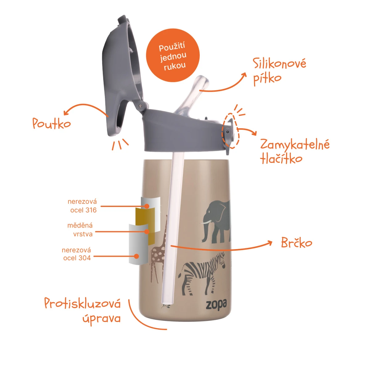Materiál: nerezová oceľ 316 + 304, silikón, plast bez BPA