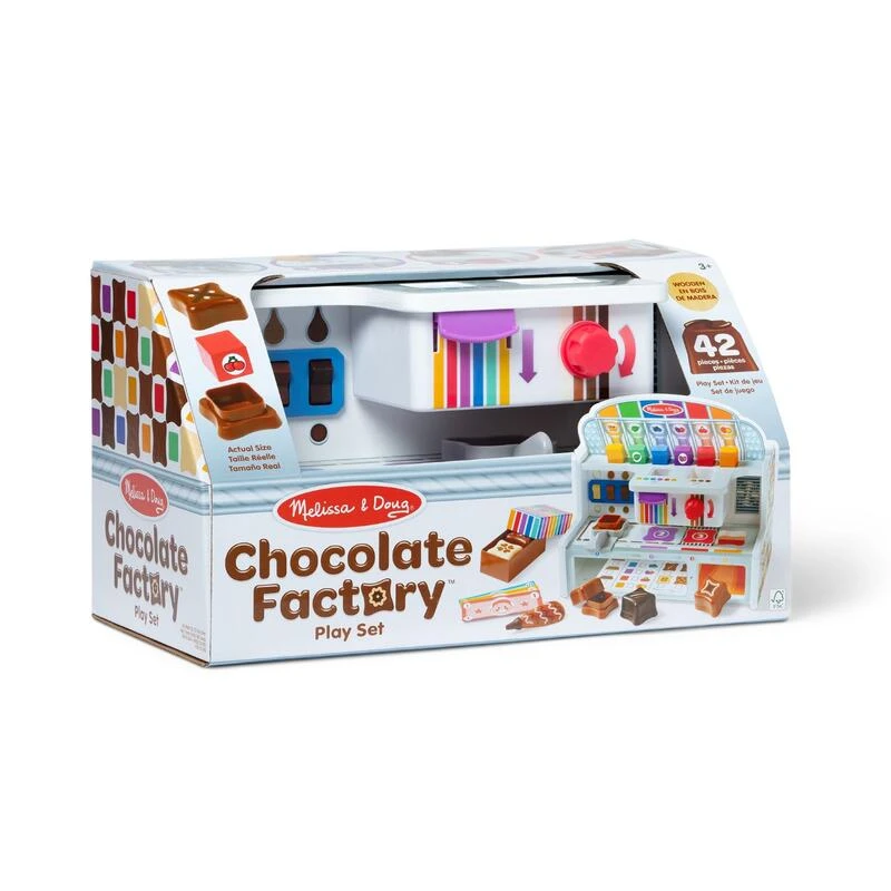 Hracia sada Chocolate Factory je skvelý spôsob, ako podporiť jemnú motoriku, zručnosti v oblasti čísel a priraďovaní, rovnako ako rozpoznávanie farieb, komunikáciu, kooperatívnu hru a naratívne myslenie.