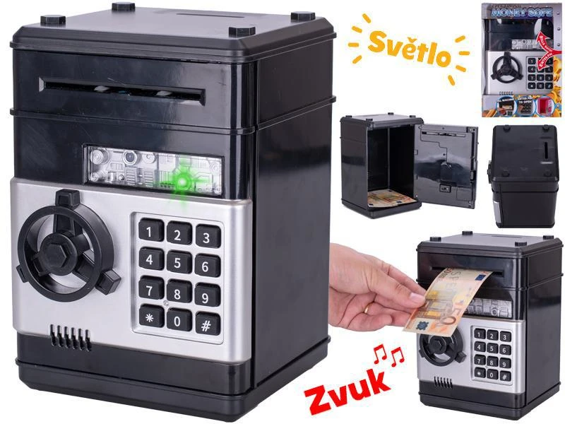 Trezor - 19,5 cm s odomykaním na kód - so svetlom, zvukom a peniazmi čierna