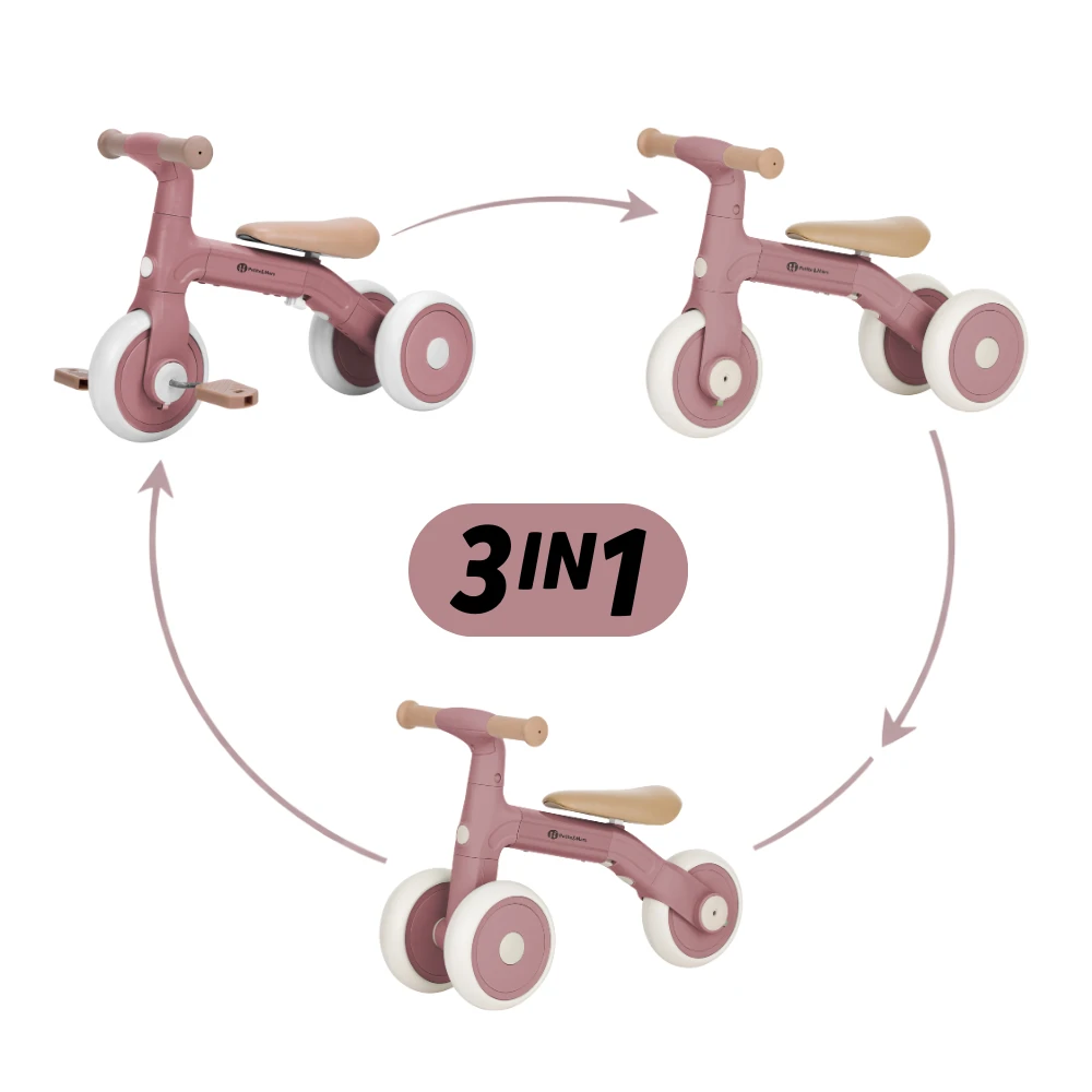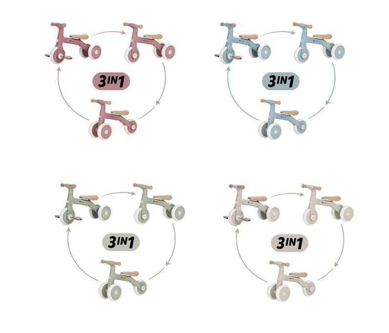 Na začiatku slúži ako stabilná trojkolka (s možnosťou upevniť dve kolieska vpredu alebo vzadu) – ideálna pre malých začiatočníkov, ktorí ešte len hľadajú rovnováhu a učia sa dôverovať vlastným nohám. Keď dieťa trochu povyrastie a začne si byť v pohybe istejšie, dá sa Bingo jednoducho prestavať na klasické balančné odrážadlo. V tejto fáze sa už odráža samo, reguluje si rýchlosť a trénuje koordináciu aj smer. A keď príde ten správny čas, stačí nasadiť pedále – Bingo sa premení na ich prvé kolo, na ktorom si môžu vyskúšať prvé šliapanie. Všetko zvládnete jednoducho a bez náradia - len pár pohybov a je hotovo.
