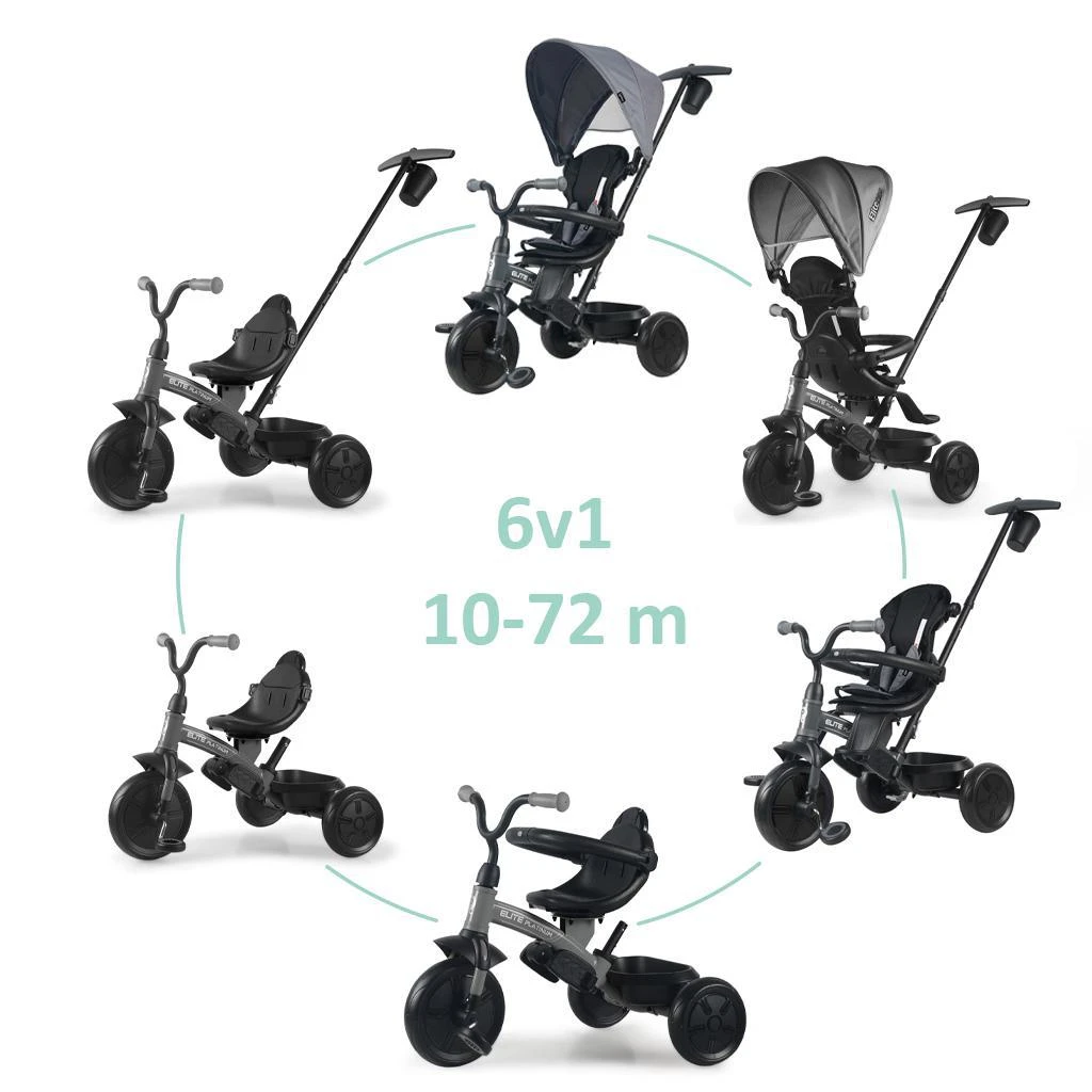 - 6v1 funkcie - Tento model ponúka 6 rôznych možností, ako trojkolku používať, od kočíka, ktorý riadi rodič, až po samostatnú jazdu na bicykli. Trojkolka je ideálna pre deti od 10 mesiacov až do 72 mesiacov.
