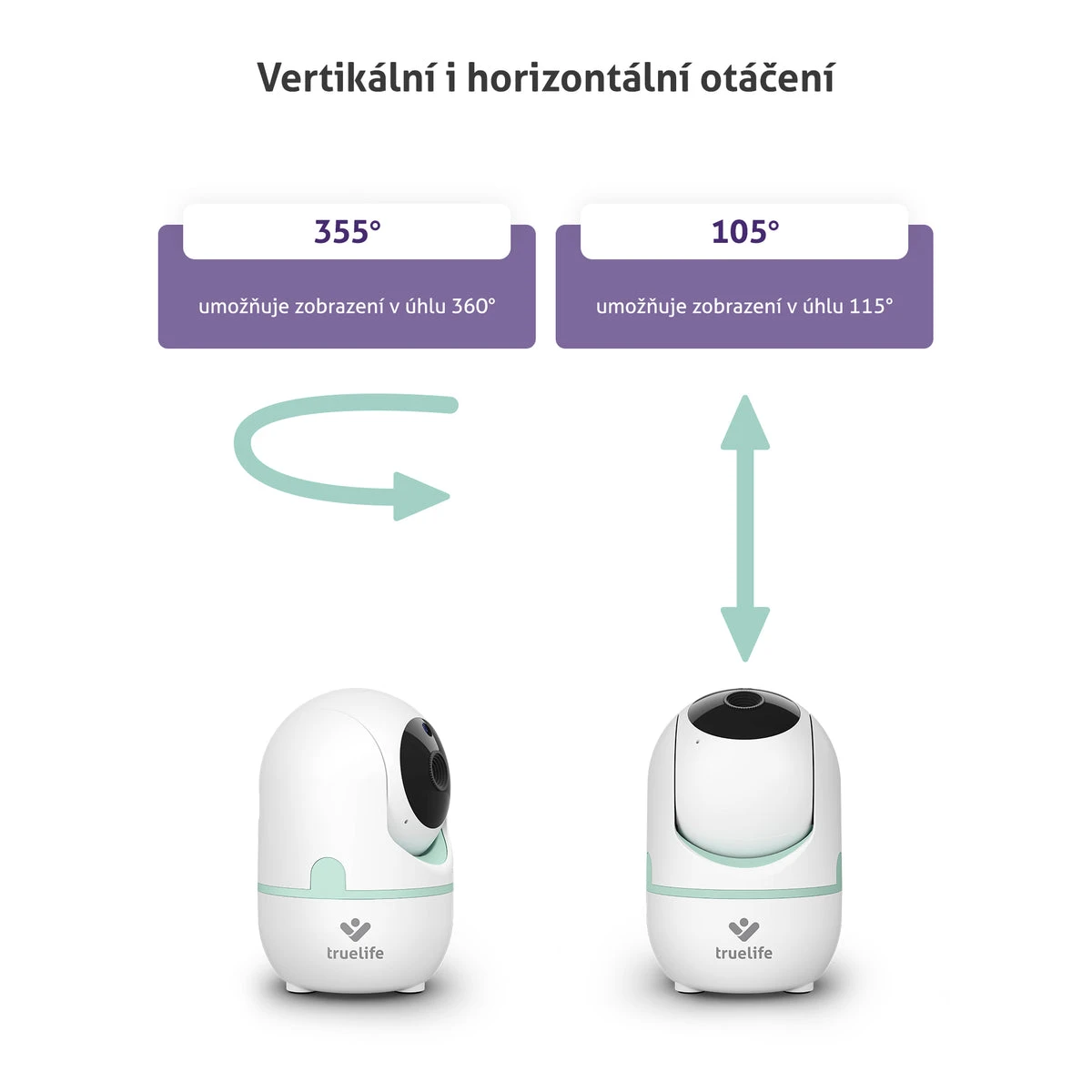 360° rotačná opatrovateľka je konštruovaná tak, že s ňou je možné pomocou rodičovskej jednotky otáčať a vidieť do každého zákutia miestnosti. Horizontálne sa vie zariadenie otáčať o 355 °, vertikálne potom o 105 °. V kombinácii so širokouhlou šošovkou tak vidí celých 360 °. Akonáhle sa zotmie, tento stav detekuje a automaticky sa prepne do režimu nočného videnia, kedy vďaka infračerveným diódam poskytuje kvalitný obraz aj za takto sťažených podmienok. Pre maximálne pokrytie priestoru, kde sa dieťa vyskytuje, je možné k rodičovskej jednotke pripojiť až 4 kamery.