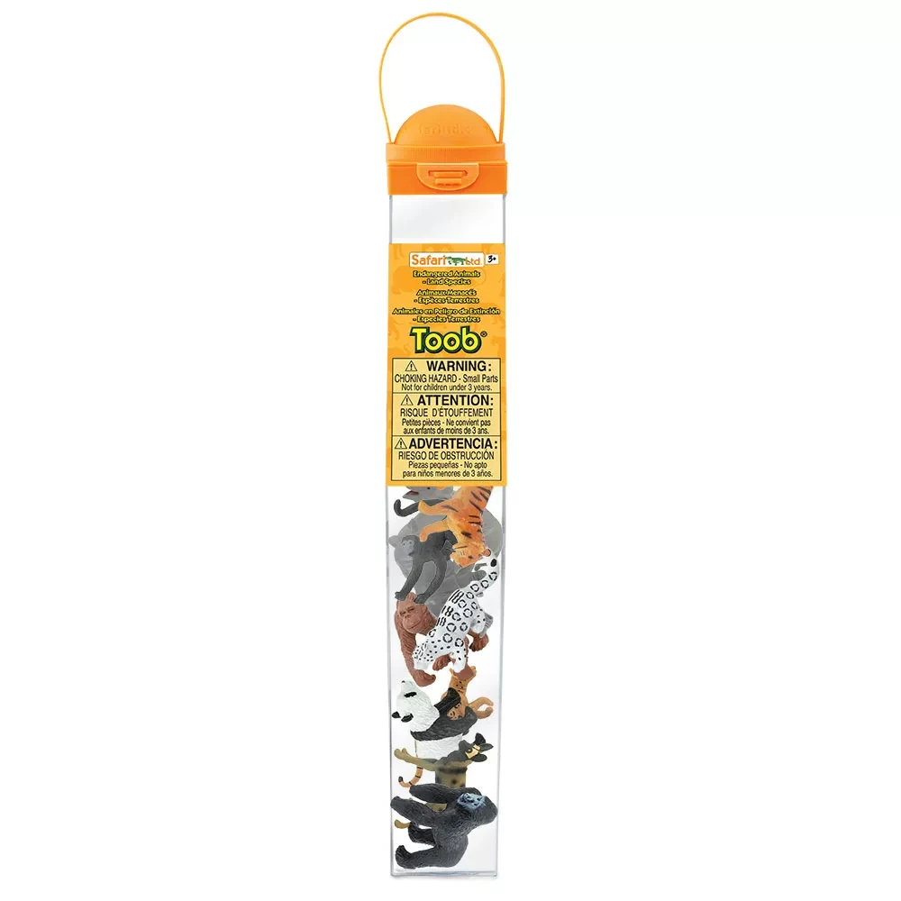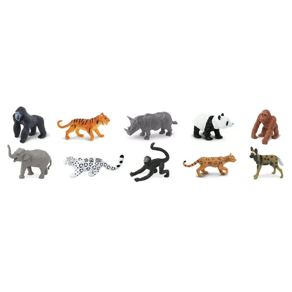 Ohrozené druhy - suchozemské: gorila horská, tiger indický, nosorožec dvojrohý, panda veľká, orangutan bornejský, slon indický, leopard snežný, chápan čierny, leopard mandžuský, pes hyenovitý.