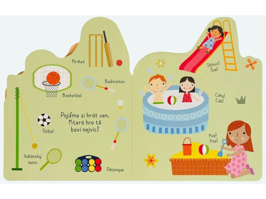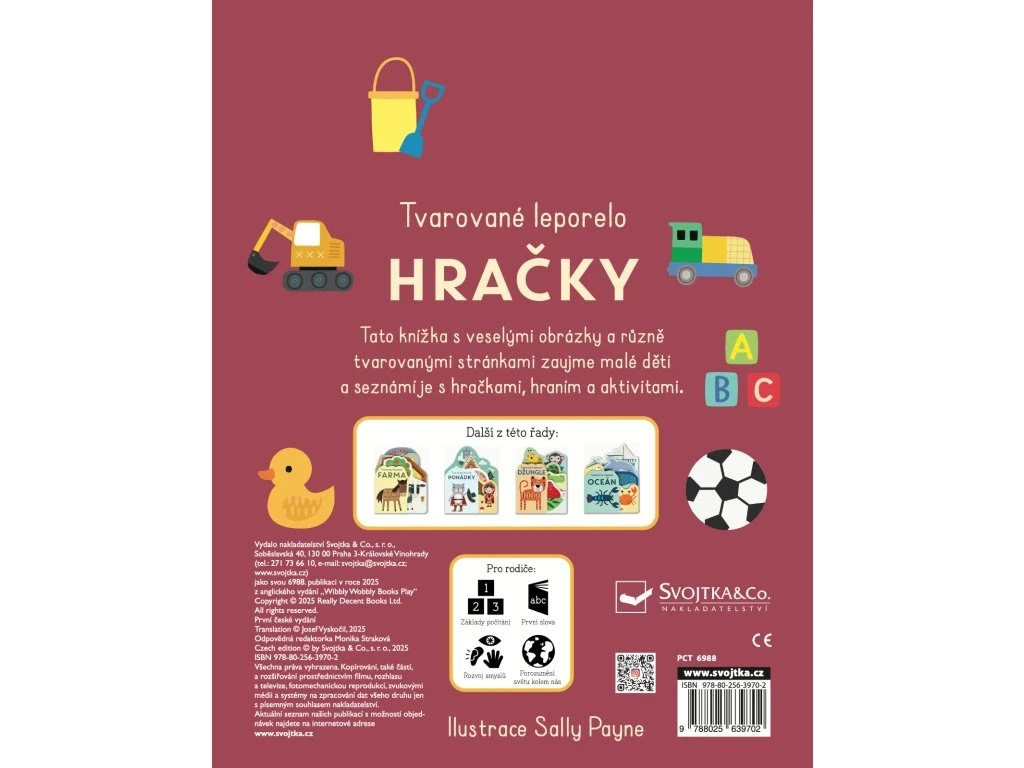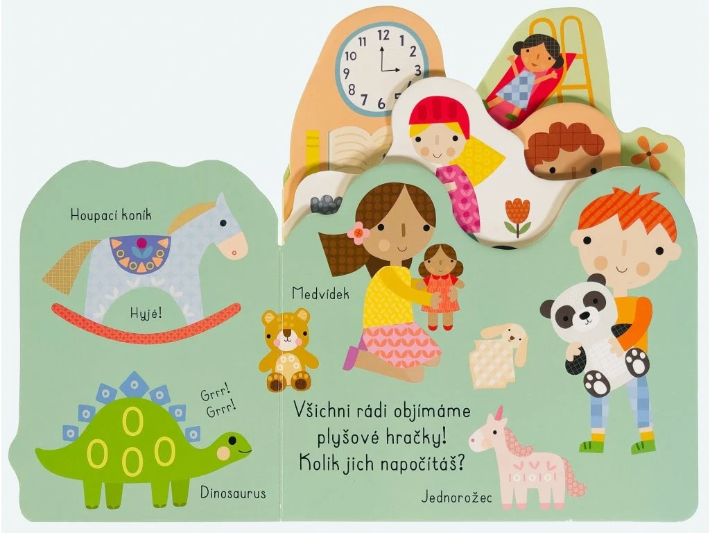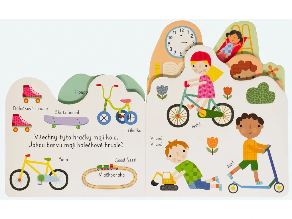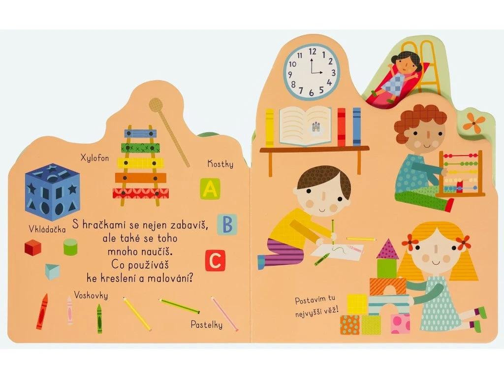 Táto knižka s veselými obrázkami a rôzne tvarovanými stránkami zaujme malé deti a zoznámi ich s hračkami, hraním a aktivitami.