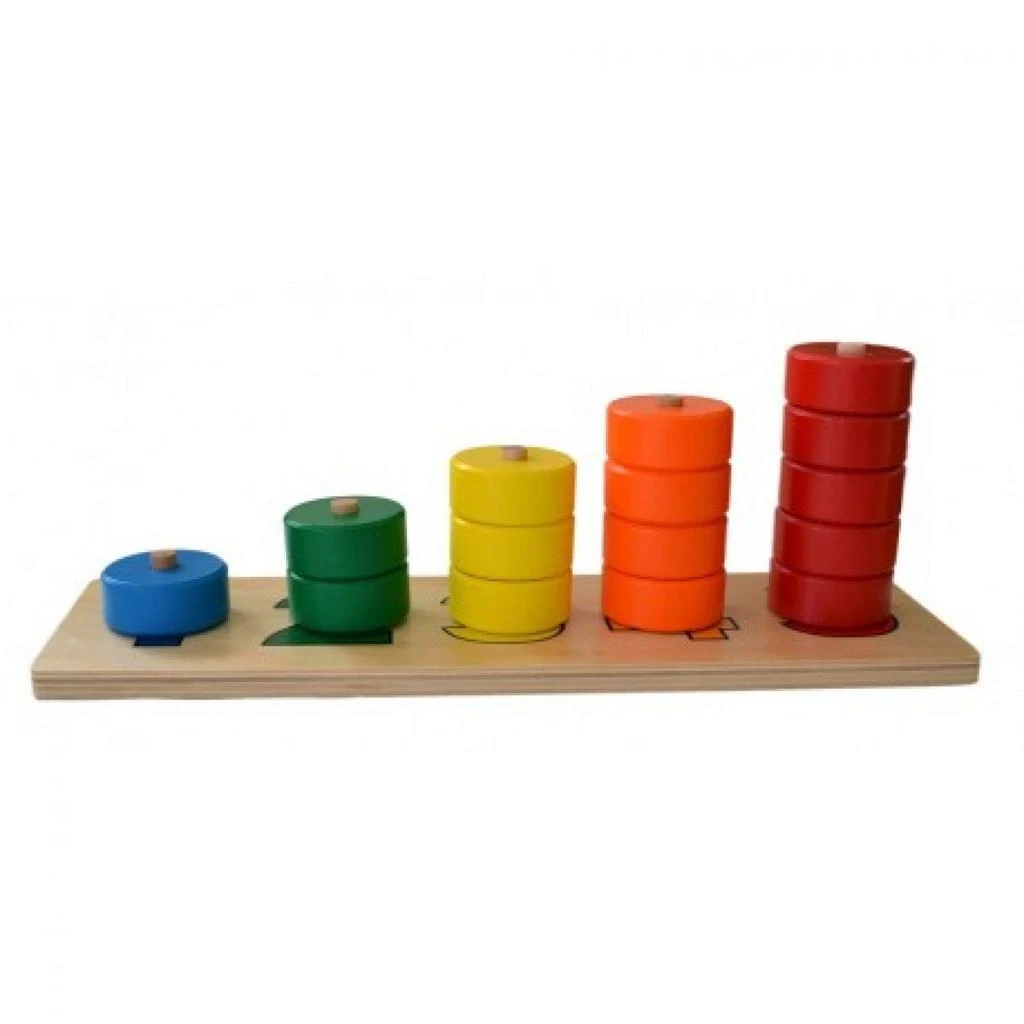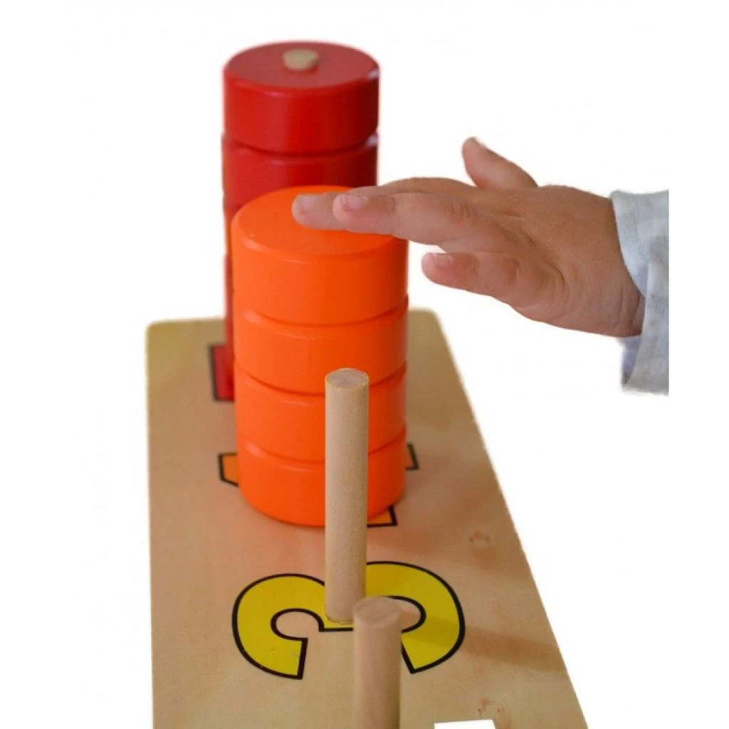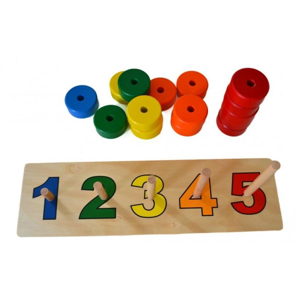 Číslo kolíkov je zvýraznené rovnakou farbou, ktorú majú zodpovedajúce kruhy, čo dieťaťu umožňuje lepšie zapamätanie si čísla.