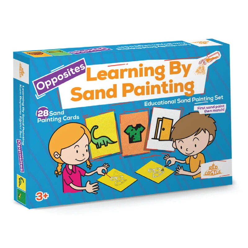 Sada obsahuje 28 kariet na maľovanie pieskom, plastovú pinzetu, farebný piesok.