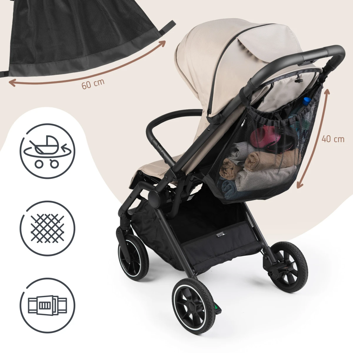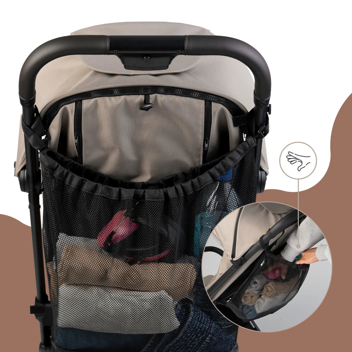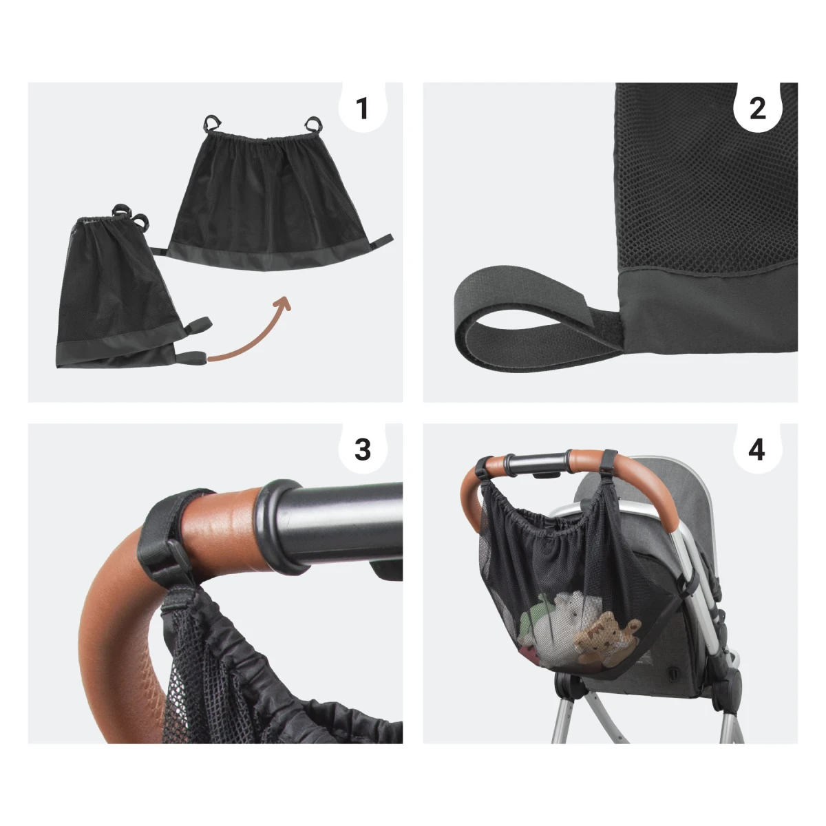 Tento priestranný a odolný sieťový organizér je určený na použitie s detskými kočíkmi. Vďaka svojmu šikovnému dizajnu v sebe kombinuje pružnú sieťovinu a textilnú tkaninu, ktoré poskytujú bezpečné a pohodlné miesto na uloženie malých predmetov, ako sú fľaše, desiaty, hygienické potreby, hračky alebo nákup.