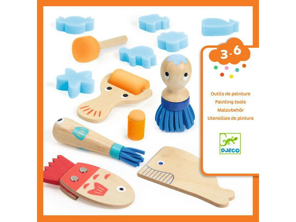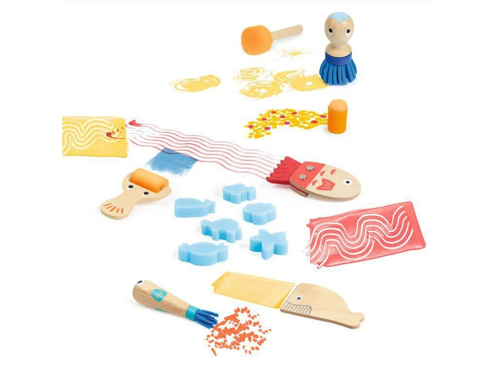 S týmito výtvarnými potrebami si deti vyskúšajú množstvo nových spôsobov maľovania a vytvoria tak jedinečné obrázky. Sada obsahuje 6 drevených maľovacích potrieb, 6 hubiek a 10 kartičiek s inštrukciami, ako maľovacie pomôcky využiť. Všetky nástroje sú vyrobené tak, aby sa deťom dobre držali a manipulácia s nimi tak bola hračkou!