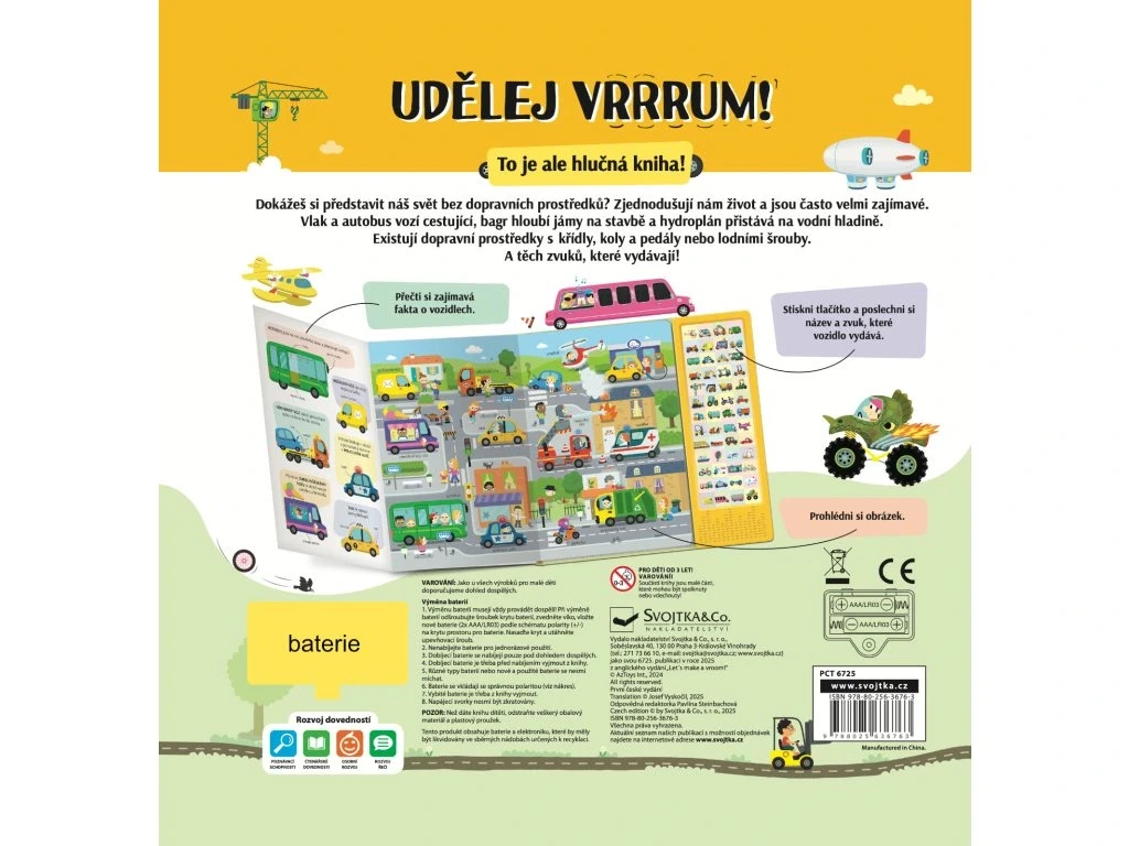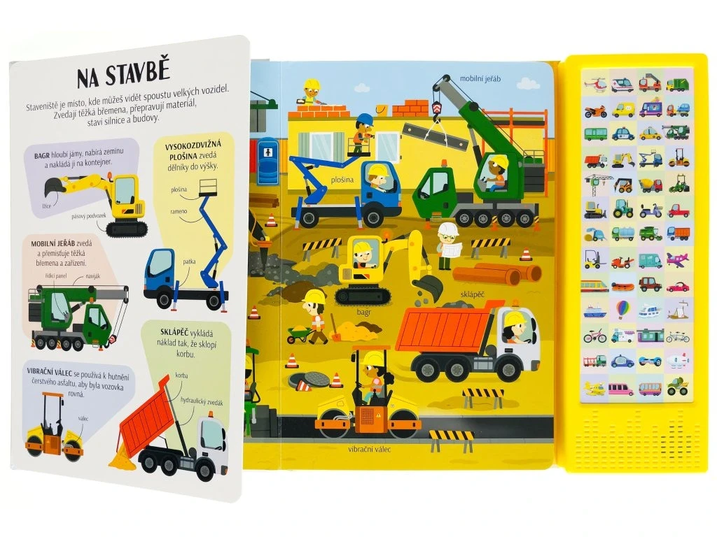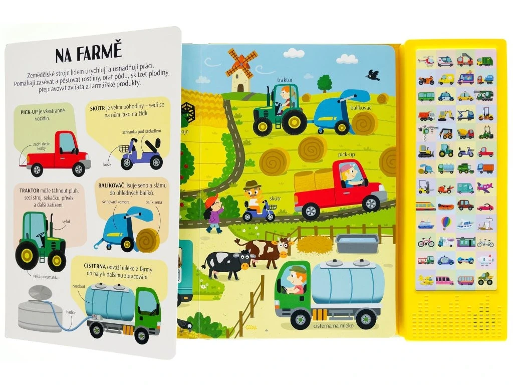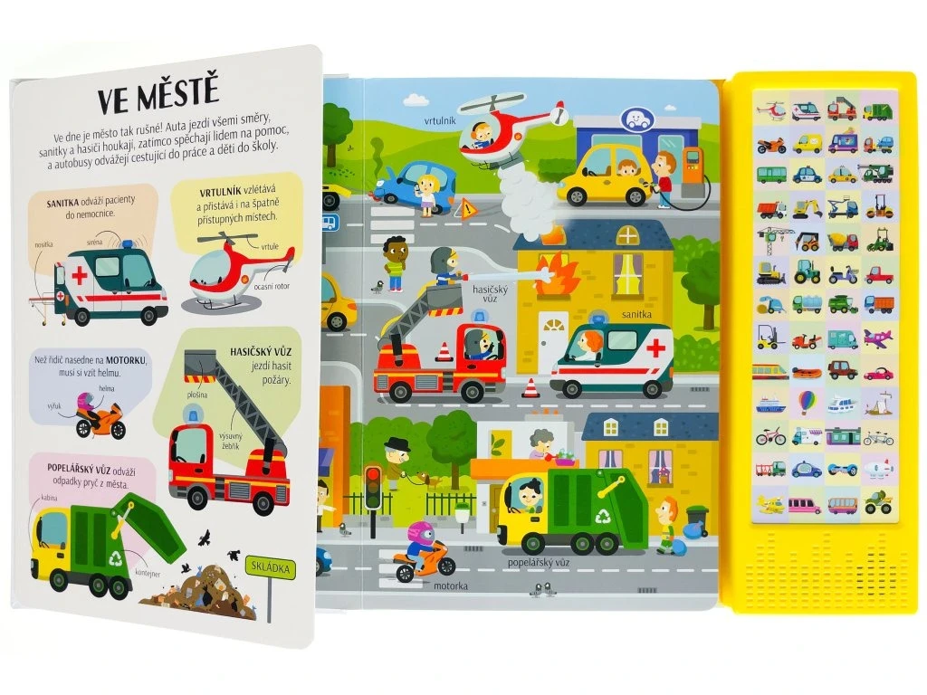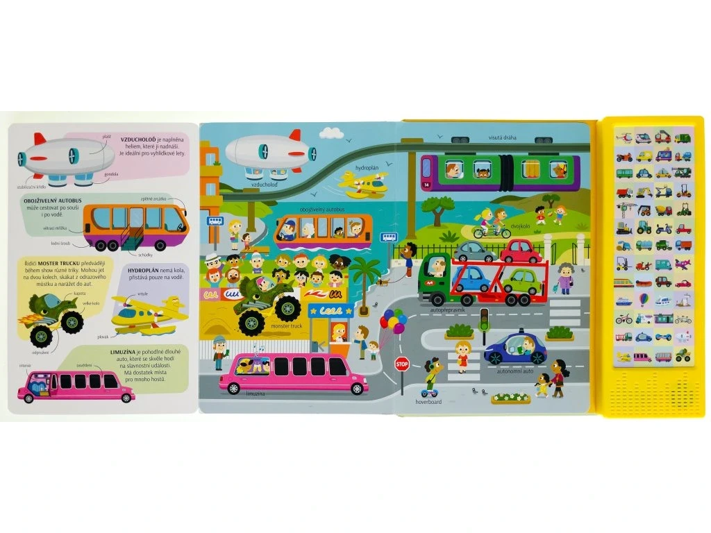 Dokážeš si predstaviť náš svet bez dopravných prostriedkov? Zjednodušujú nám život a sú často veľmi zaujímavé. Vlak a autobus vozia cestujúcich, bager hĺbi jamy na stavbe a hydroplán pristáva na vodnej hladine. Existujú dopravné prostriedky s krídlami, kolesami a pedále alebo lodnými skrutkami. A tých zvukov, ktoré vydávajú! Tak neváhaj, rozlož stránku, stlač tlačidlo a vypočuj si názov a zvuk, ktoré vozidlo vydáva. Pozri si obrázok, nájdi vozidlo av ľavej časti si o ňom prečítaj pár zaujímavostí. Zvukový modul obsahuje 50 tlačidiel so zvukmi.