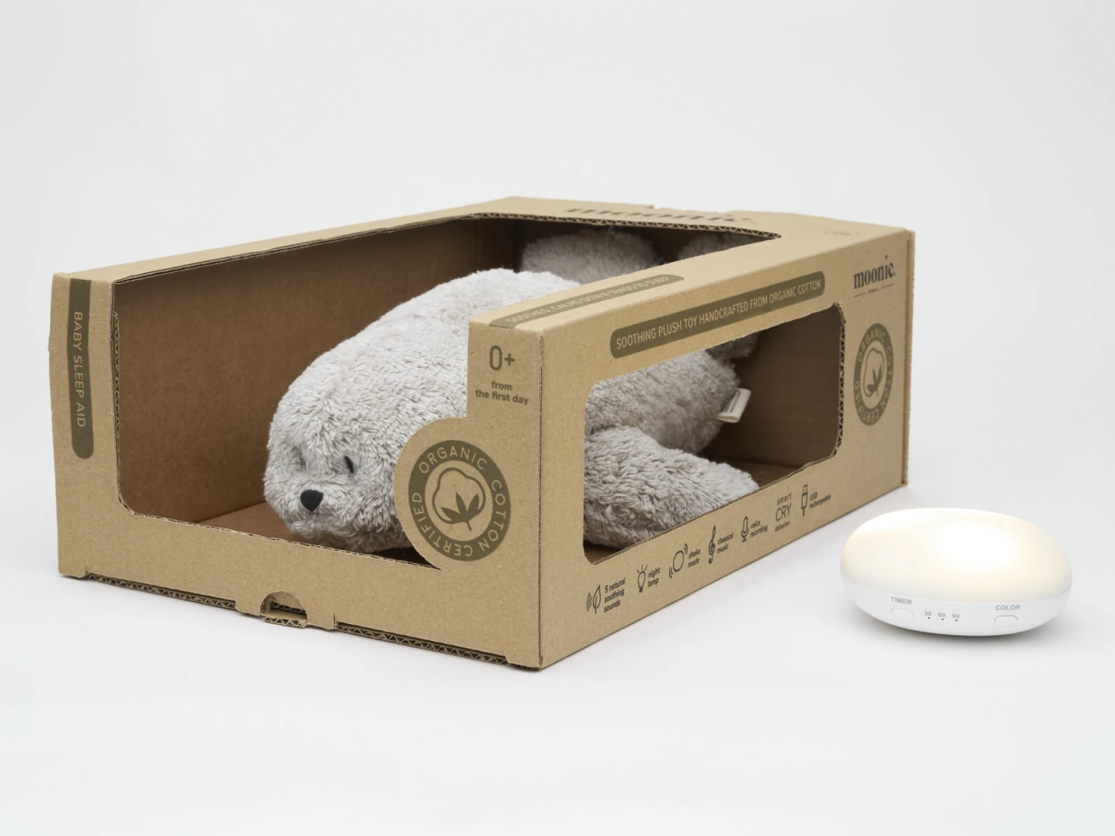 Moonie zaspávačik v podobe roztomilého tuleňa s nočným svetlom a relaxačnými zvukmi pomáha bábätku upokojiť sa a ľahšie zaspať. Upokojujúce zvuky pripomínajú dieťaťu prostredie v maternici mamičky pred jeho narodením. Usínáček ponúka päť prírodných relaxačných zvukov (tlkot srdca, vietor, lesný potok, morské vlny, dážď), kalimba uspávanku, dve klasické uspávanky a umožňuje nahranie vlastného hlasu.