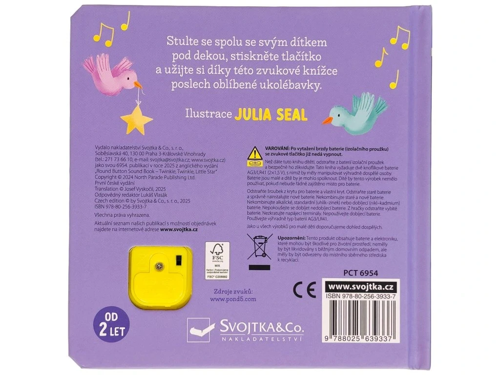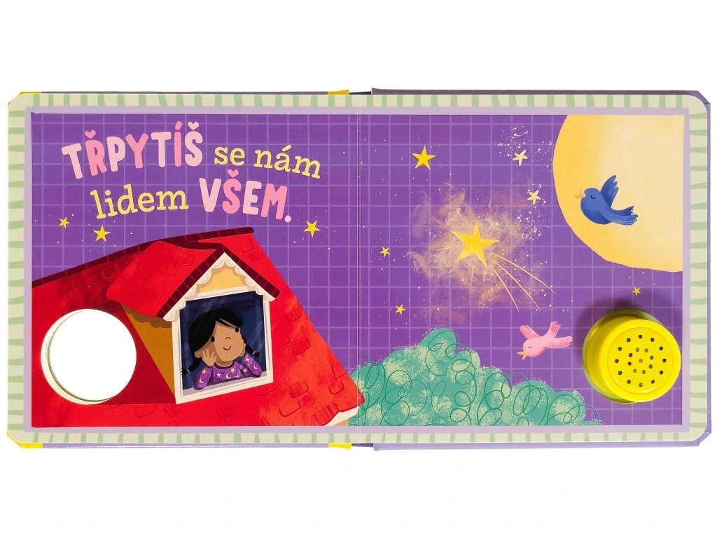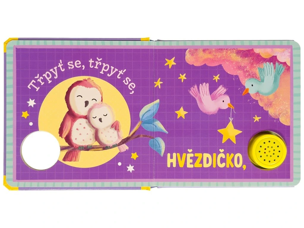 Zvukové leporelo so známou uspávankou "Třpyť sa, trblietať sa, hviezdičko" pozýva tie najmenšie deti na cestu do postieľok za počúvania upokojujúce melódie. Stúľte sa so svojím dieťaťom pod dekou, stlačte veľké tlačidlo vhodné aj pre malé prstíky a nechajte sa unášať tónmi klasickej uspávanky. Táto interaktívna kniha je navrhnutá špeciálne pre bábätká a batoľatá a ponúka nielen počúvanie obľúbenej melódie, ale aj nádherné ilustrácie, ktoré podporia rozvoj zrakového a sluchového vnímania. Je ideálnym spoločníkom na večerné zaspávanie alebo pokojné chvíľky plné pohody. Tešiť sa môžete na zážitok plný nežných tónov a trblietavých hviezd.