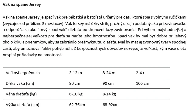 Vak na spanie pre bábätká a batoľatá určený pre deti, obvykle od približne 3 mesiacov. Vak na spanie Jersey má úzky strih, pružný dizajn podobný ako pri zavinovačke a odporúča sa ako „prvý spací vak“ dieťaťa po skončení fázy zavinovania. Dizajn schválený pre bezpečný spánok je vyrobený z mäkkej, elastickej organickej bavlny s certifikátom GOTS, ktorá je netoxická a šetrná k pokožke dieťaťa. Ergonomicky navrhnutý vak má zvonovú spodnú časť, ktorá podporuje zdravý vývoj bedrových kĺbov a je schválená Medzinárodným inštitútom pre dysplázu bedrových kĺbov a materiál je elastický, aby sa dieťa mohlo počas spánku voľnejšie pohybovať a zostať v pohodlí.