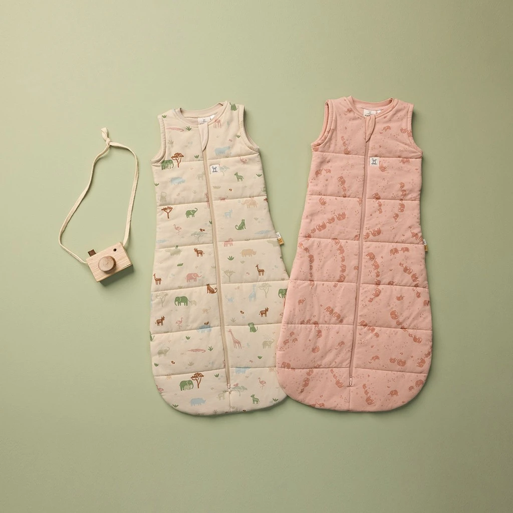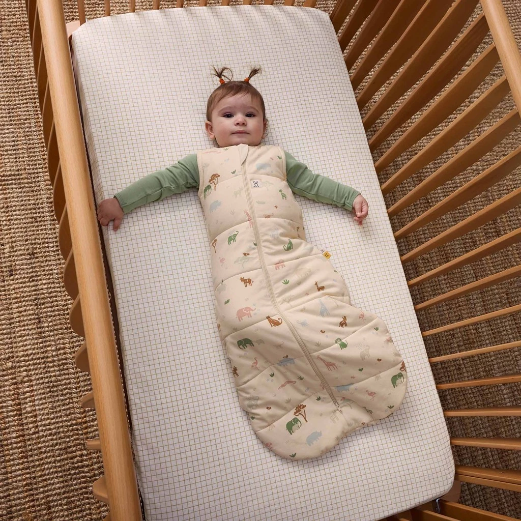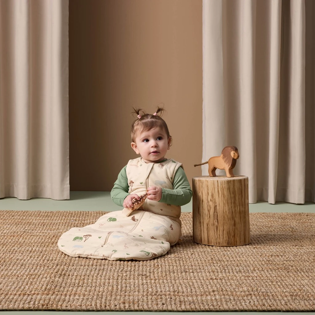 Spací vak z organickej bavlny Jersey Savannah 2,5 TOG od ErgoPouch ponúka bábätku mäkké, bezpečné a príjemne teplé prostredie na pokojný spánok po celú noc.