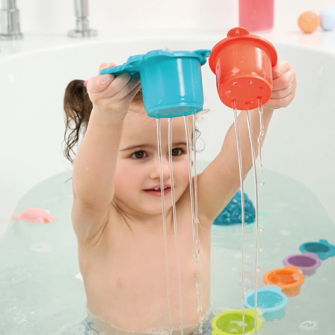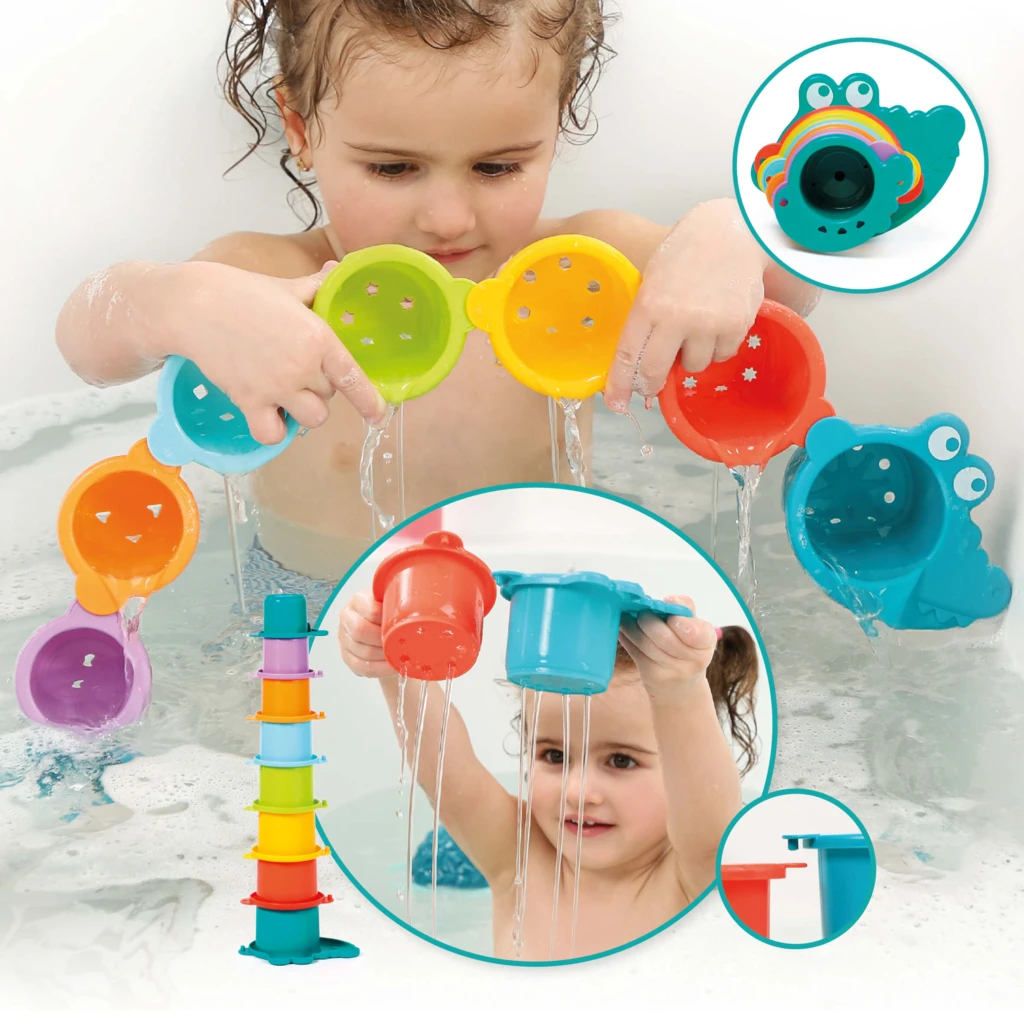 Zábavu dopĺňa striekací krab, lodička a krokodíl so sadou 8 stohovateľných kelímkov, ideálnych pre vodné experimenty a efekty dažďa