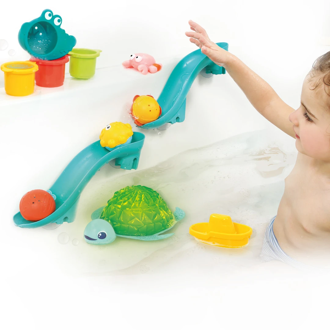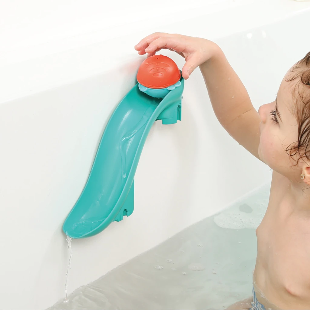 Vodné šmykľavky a loptičky - dve odnímateľné šmykľavky s prísavkami môžete upevniť na vaňu alebo obklady – vytvoríte tak jedinečnú vodnú dráhu pre tri loptičky