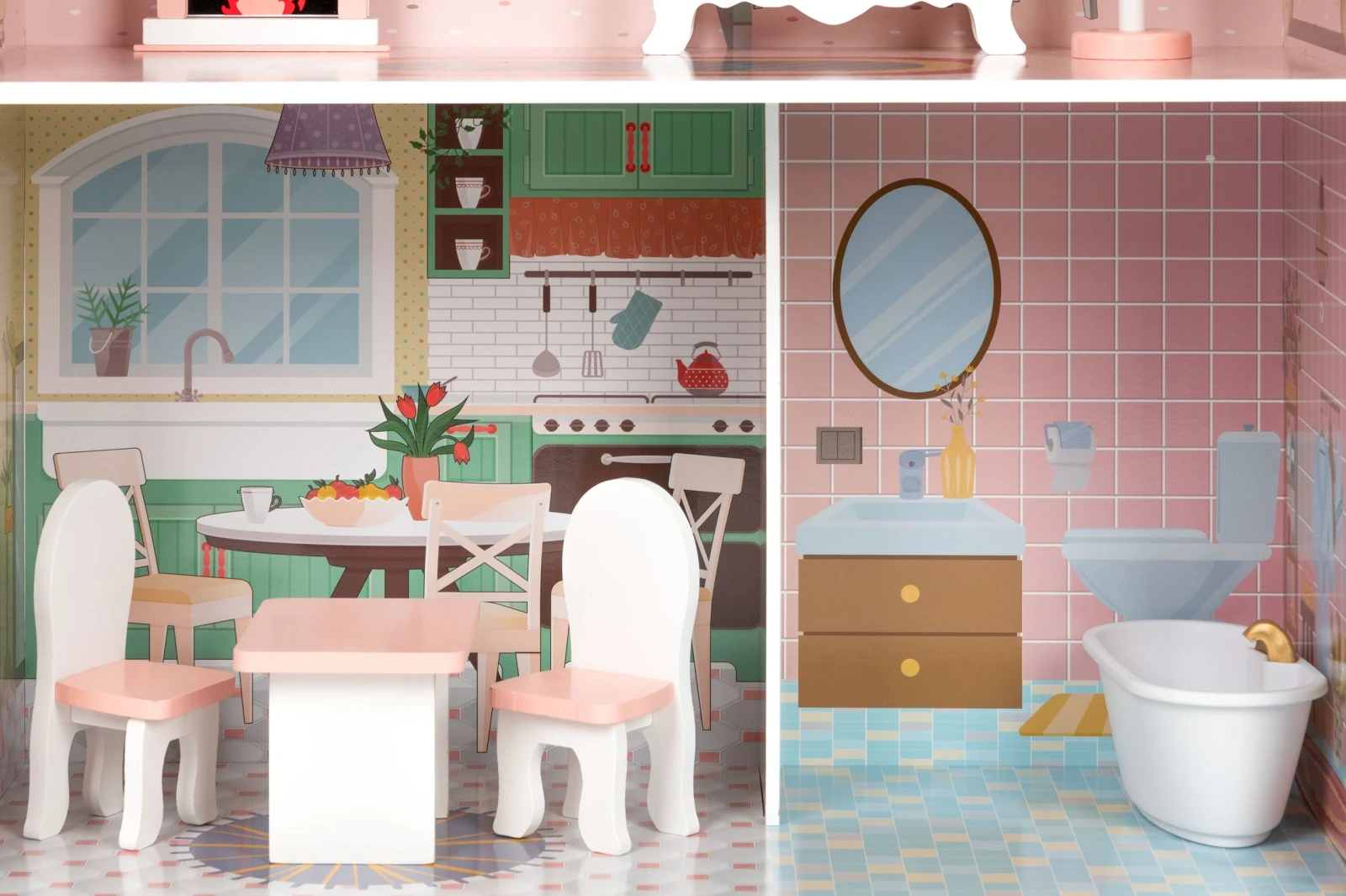 Celý domček má 3 samostatné poschodia a dokopy 5 miestností, vrátane terasy umiestnenej na najvyššom poschodí. Každá miestnosť je vyvedená v inom štýle, pričom výbava aj nábytok zodpovedajú charakteru daného priestoru. Nič však nebráni tomu, aby sa vaše dieťa pohralo na interiérového dizajnéra a všetko si usporiadalo podľa svojich predstáv. 3 samostatné poschodia a 5 miestností pre nekonečnú zábavu.