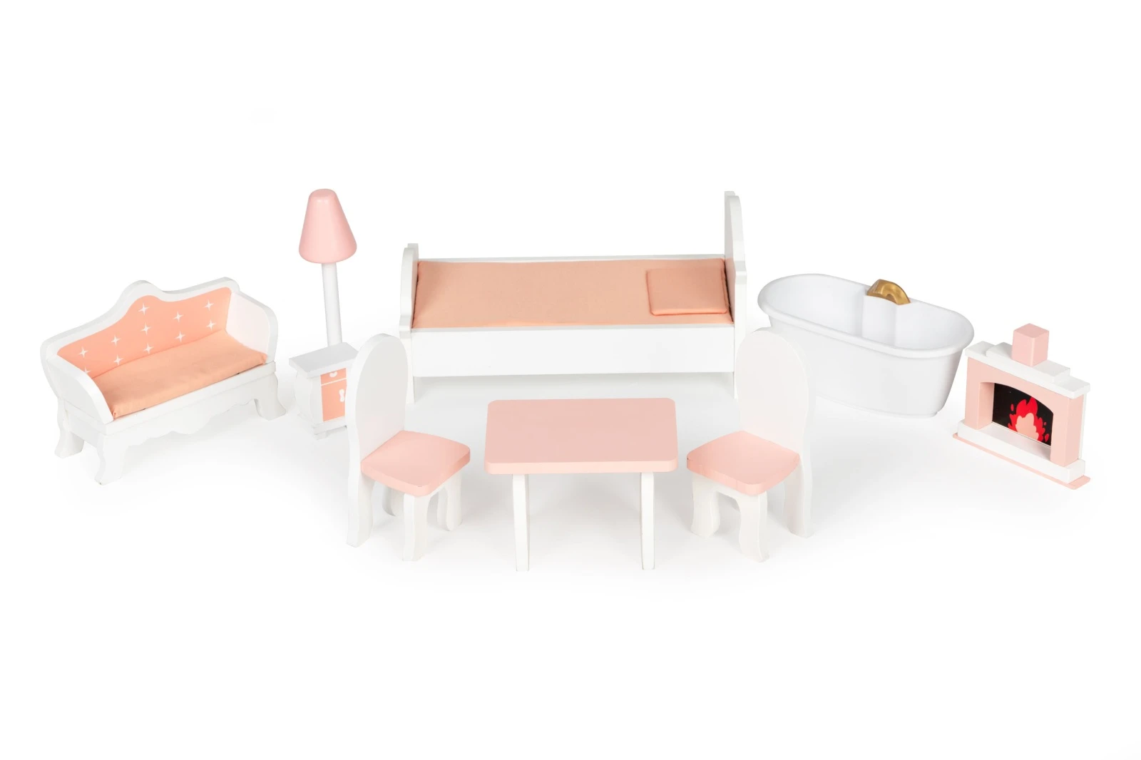V sade 9 farebných drevených kusov nábytku: Lampa, posteľ, skrinka, krb, stôl, dve stoličky, pohovka, vaňa.