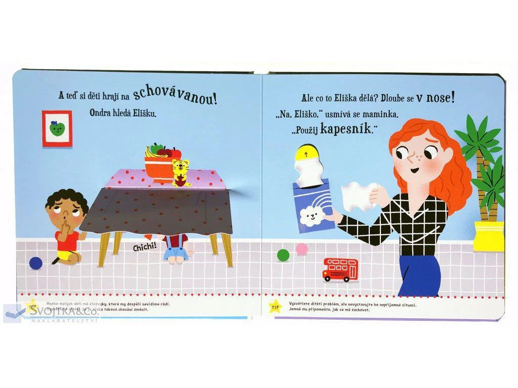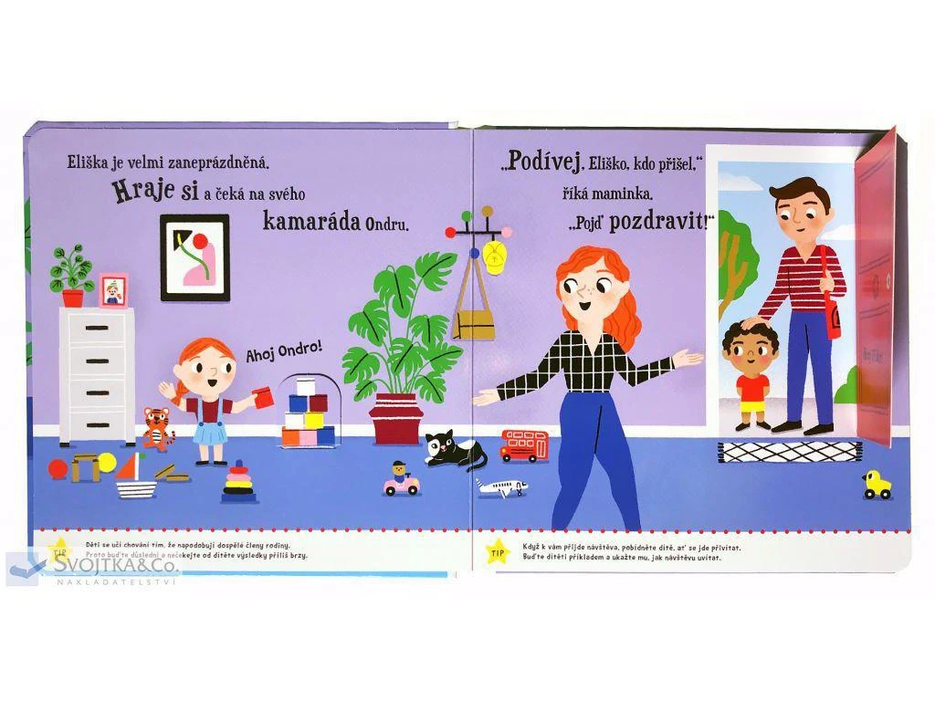 Eliška sa veľmi teší na svojho kamaráta Ondru. Vie už návštevu privítať? Vie sa s kamarátom podeliť o hračky? S pomocou tejto knihy môžete učiť svoje dieťa, ako byť slušný. Kniha plná pohyblivých prvkov obsahuje na každej dvojstrane radu pre rodičov. Vedieť poďakovať, o niečo požiadať, odnaučovať sa zlozvyky, podeliť sa a byť milý na návštevu patrí medzi základy slušného správania. Začať si ich osvojovať môže dieťa napríklad hneď teraz.