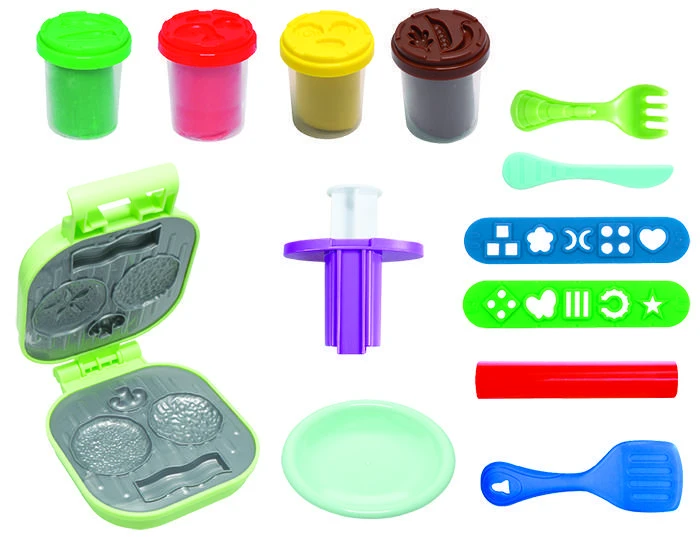 Modelína, v ktorej sú rôzne tvorítka a formičky na výrobu hamburgera. Vrátane modelovacej hmoty.