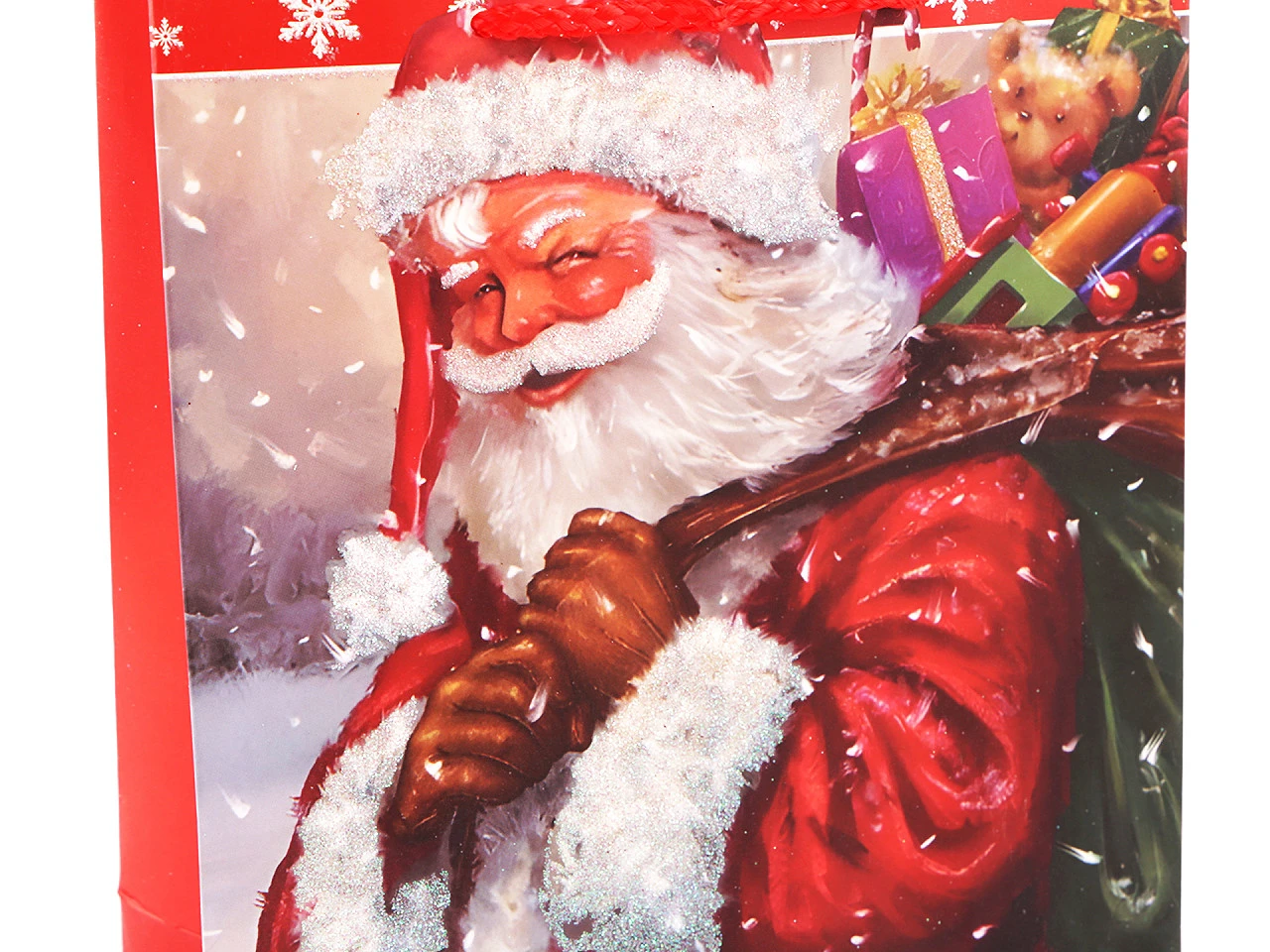 Vianočná darčeková taška s motívom Santa Clausa s glitrami je vyrobená z kvalitného pevného kriedového papiera.
