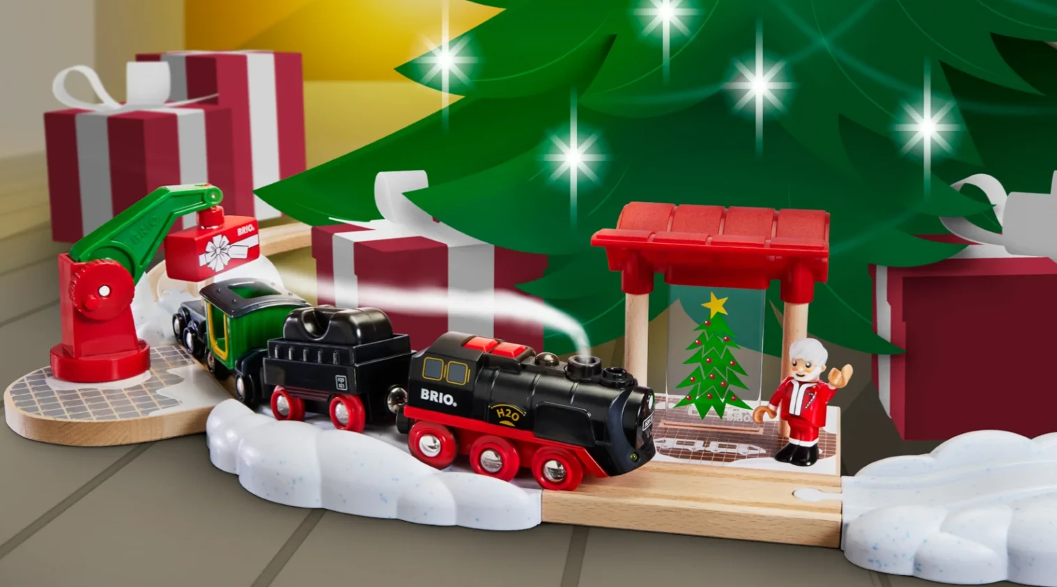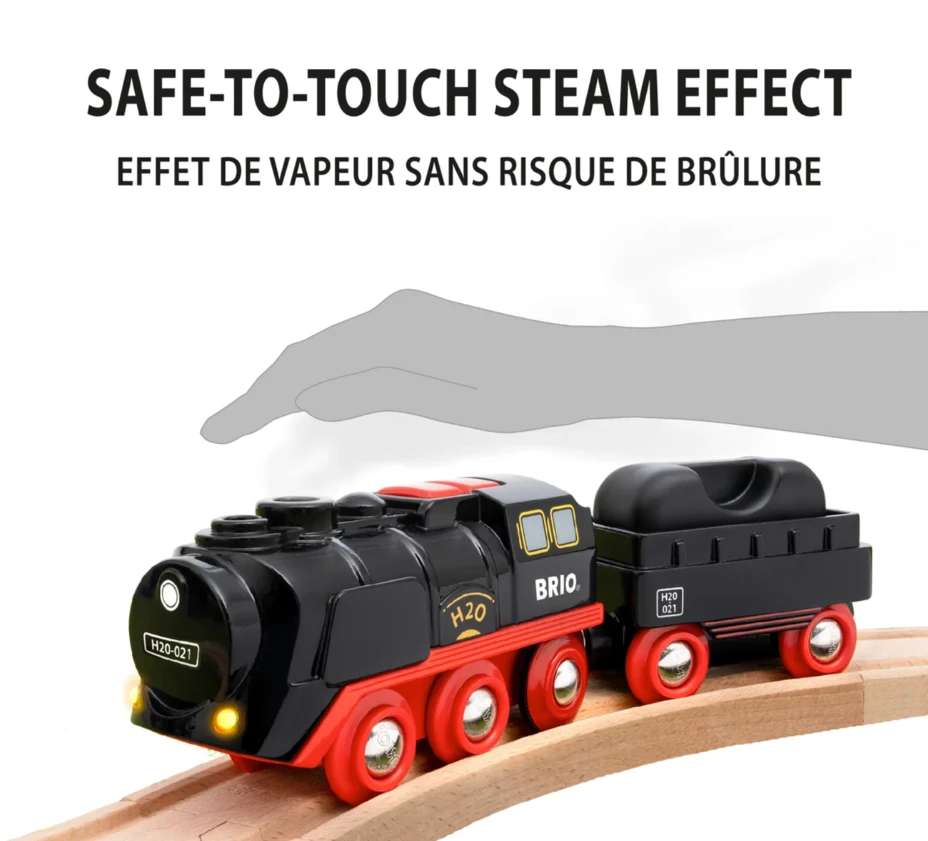 Postavte koľaje okolo stojana vianočného stromčeka a sledujte, ako sa po nich rozbieha parná lokomotíva s realistickým efektom pary, ktorá je úplne bezpečná a ľahko doplniteľná vodou.