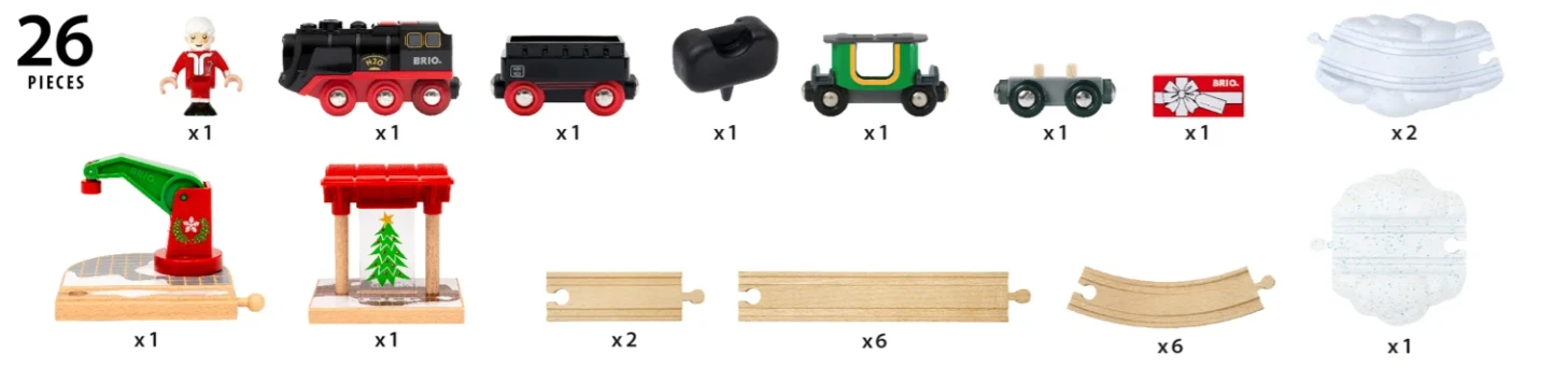 Sada obsahuje 27 dielov vrátane parnej lokomotívy na batérie, zásobníka vody, dvoch vagónikov, žeriava, polárnej stanice, zasnežených a drevených koľajníc, figúrky Santu aj označenie Severného pólu.