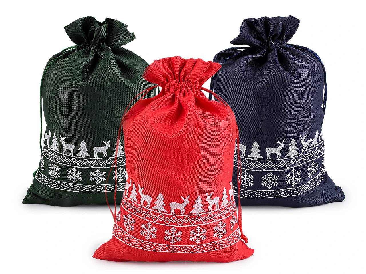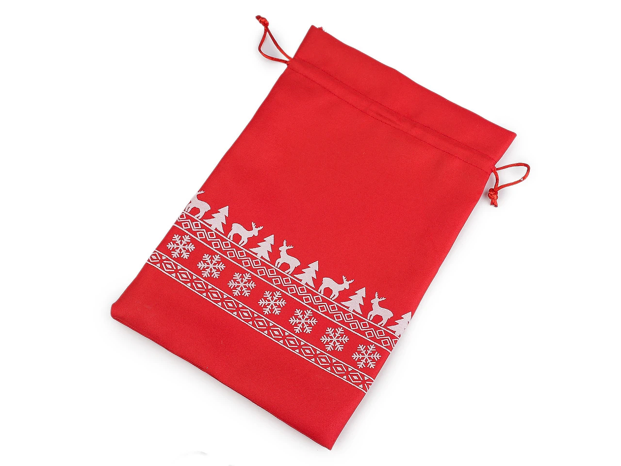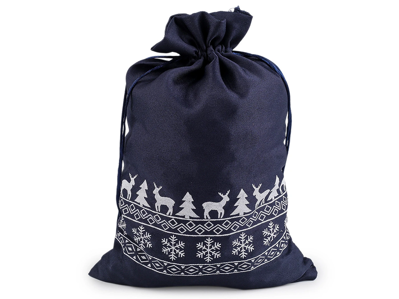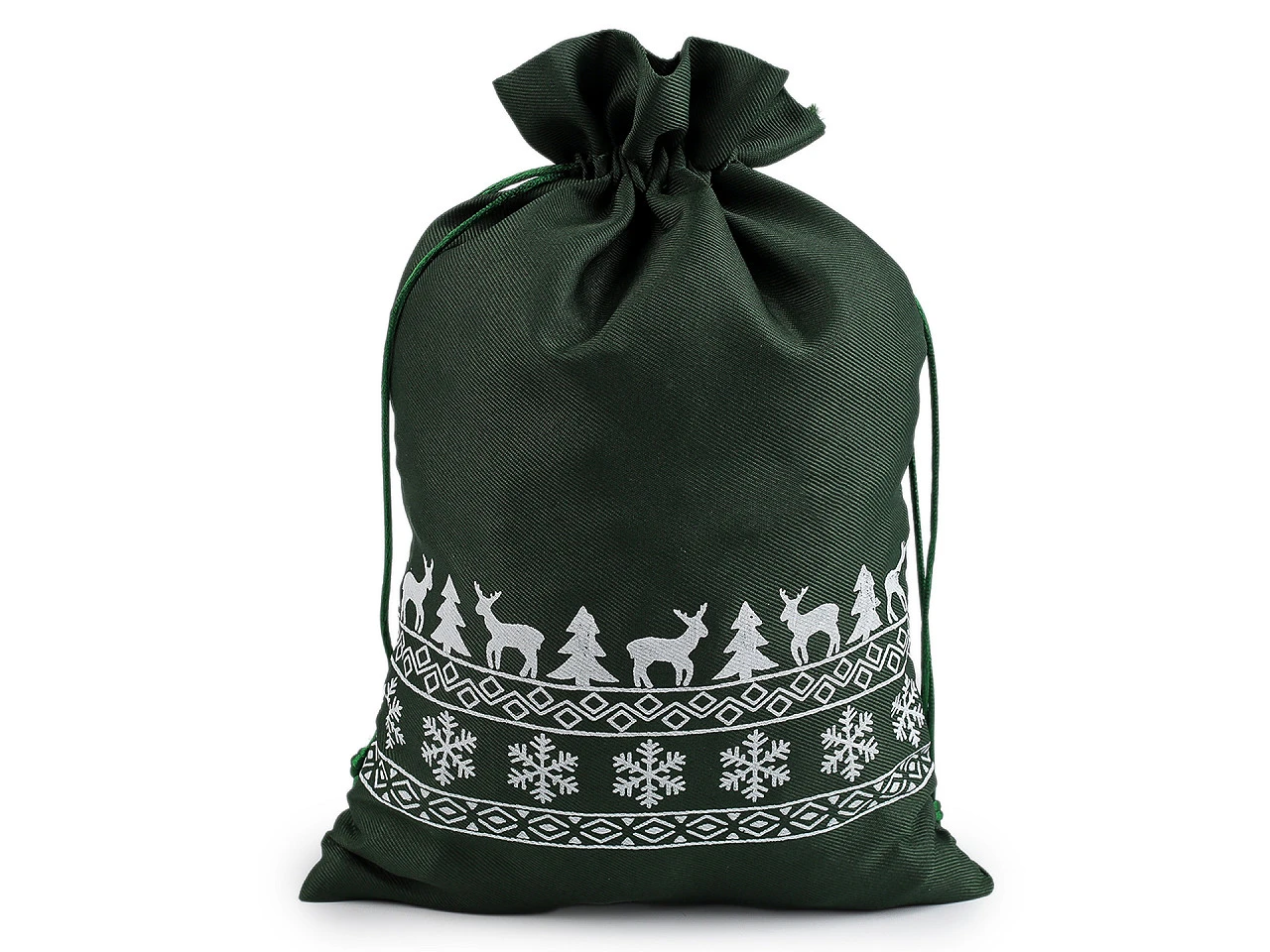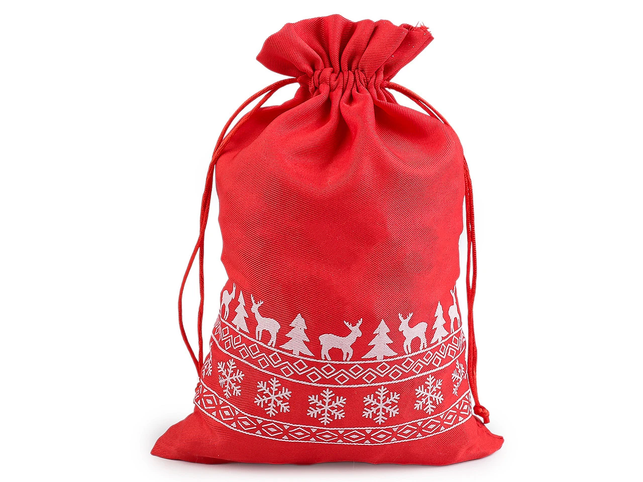 Vianočné darčekové vrecúško je z oboch strán ozdobené potlačou sobov, stromčekov a vločiek.