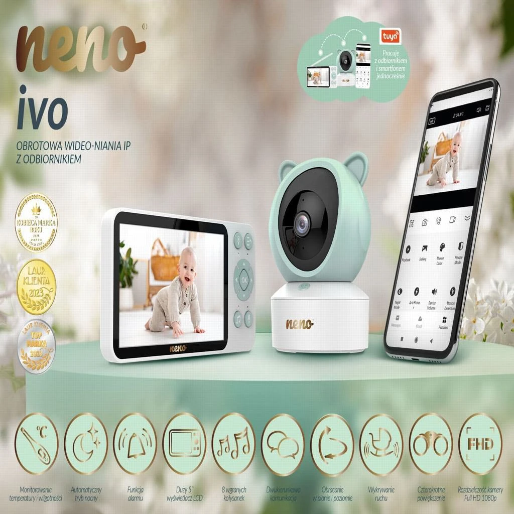 Obsah balenia: - 1× kamera Neno Ivo – 1× prijímač s 5” LCD displejom – 2× napájací adaptér – 1× flexibilný držiak – 1× montážna sada na stenu – Užívateľský manuál Technické parametre: – Displej: 5” LCD – Rozlíšenie kamery: Full HD 1080p (1920 × 10 720 px - Horizontálny otočný rozsah: 355 ° - Vertikálny otočný rozsah: ±55 ° - Nočné videnie: automatické, do 5 m - Dosah signálu: až 500 m (v exteriéri), 100 m (vnútri) - Batéria (prijímač): 3,000 m nie (pripojenie k smartfónu cez TUYA aplikáciu) - Napájanie: DC 5 V / 1 A - Vstupné napätie adaptéra: 220-240 V, 50-60 Hz - Prevádzková teplota: -30 až 65 °C - Rozmery prijímača: 160 × 80 × 16 mm - 8 Hmotnosť: prijímač 171 g, kamera 220 g Rozmery produktu: 23,6 x 18,5 x 9,2 cm Dôležité: Toto zariadenie spĺňa všetky platné normy týkajúce sa elektromagnetických polí a jeho používanie je bezpečné, ak sa riadite pokynmi uvedenými v užívateľskej príručke.