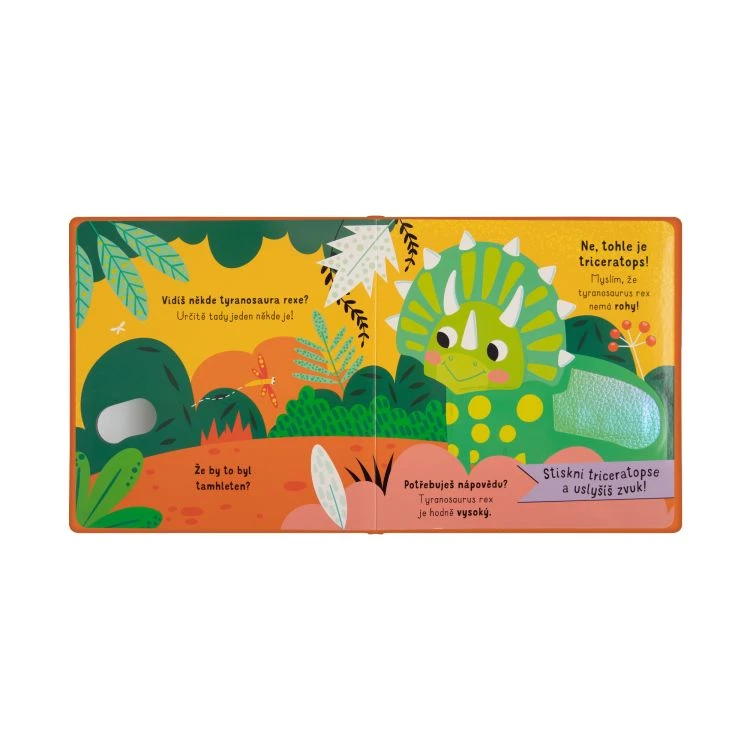 Na každej stránke si môžu malí čitatelia siahnuť na dinosaura – v knižke si tak môžu pohladiť triceratopsa, brachiosaura, spinosaura, ankylosaura, stegosaura aj tyranosaura rexa.