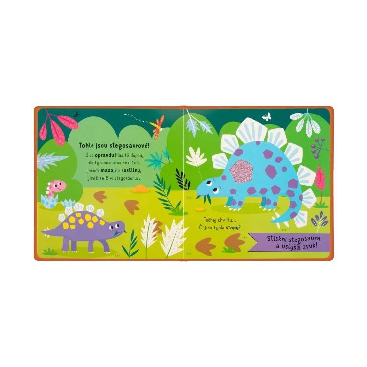 Každá stránka ponúka hmatové prvky a zvuky dinosaurov. Podporuje rozvoj zmyslov a jemnej motoriky. Väzba: pevná polstrovaná