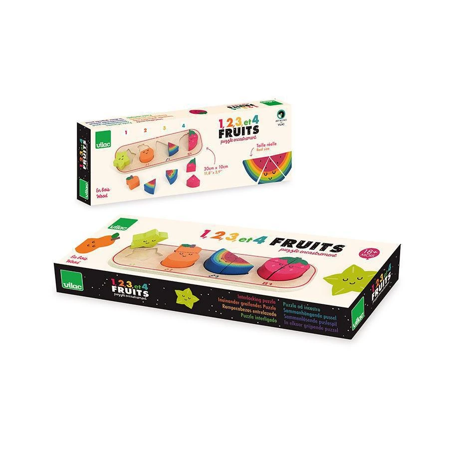 Táto drevená hra s ovocnými dielikmi hravou formou zoznamuje deti s číslami od 1 do 4.