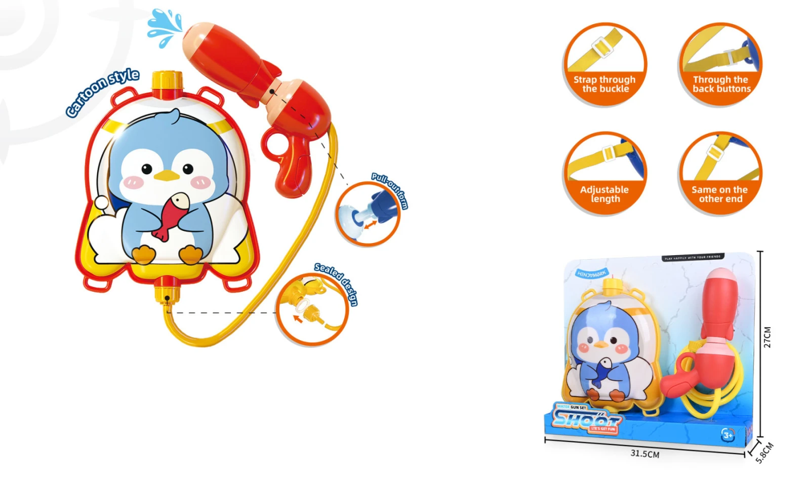 Osviežujúca letná zábava s roztomilým tučniakom! Táto hravá vodná pištoľ s batohovou nádržkou prinesie deťom nekonečné vodné dobrodružstvo. Vďaka praktickému ruksaku v tvare tučniaka majú deti dostatok vody na dlhé striekanie bez častého doplňovania.