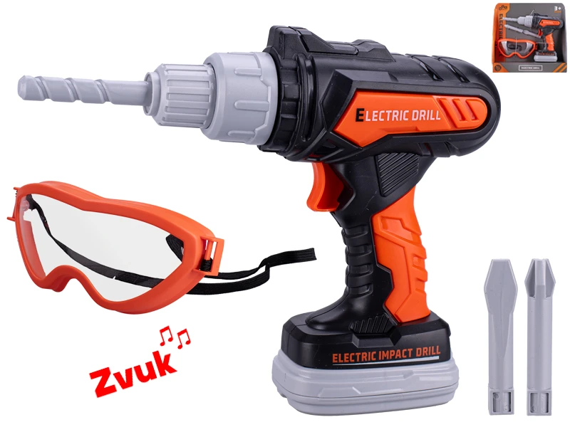 Vŕtačka príklepová na batérie so zvukom + okuliare a 2 vrtáky