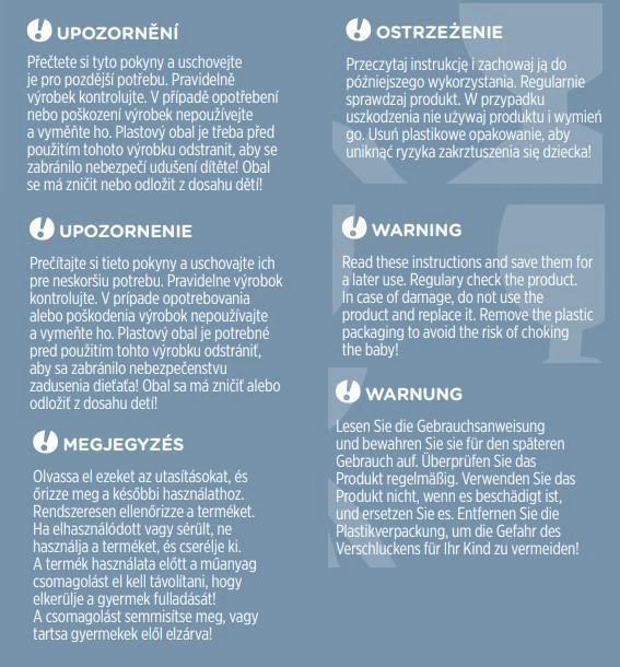 UPOZORNENIE! Pravidelne výrobok kontrolujte. V prípade opotrebovania alebo poškodenia výrobok nepoužívajte a vymeňte ho. Plastový obal je potrebné pred použitím tohto výrobku odstrániť, aby sa zabránilo nebezpečenstvu udusenia dieťaťa! Obal sa má zničiť alebo odložiť z dosahu detí!