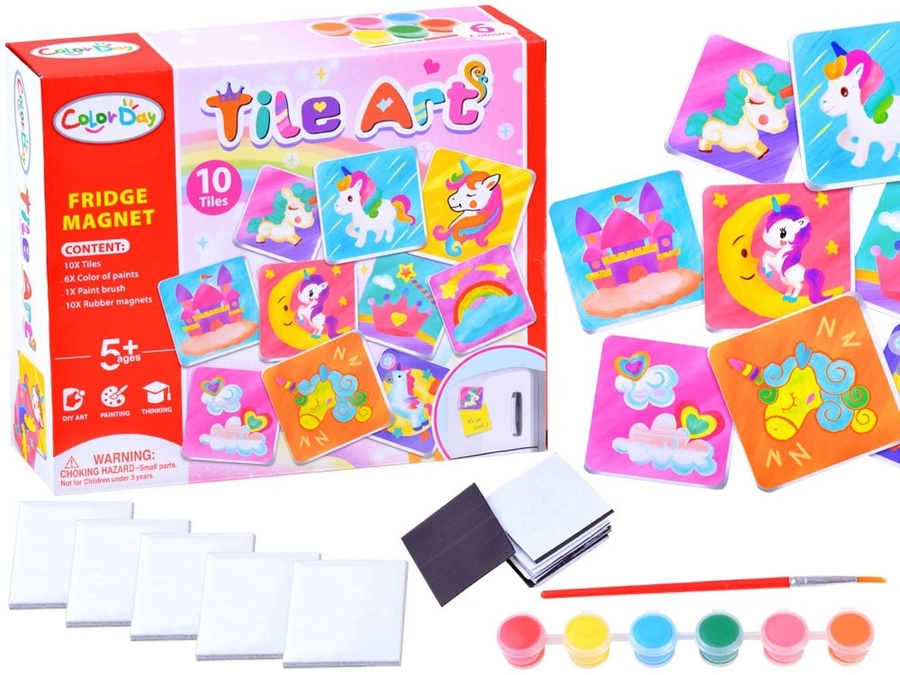 Výroba magnetov na chladničku. Balenie obsahuje 10 magnetov, 6 farbičiek, štetec a 10 porcelánových doštičiek.