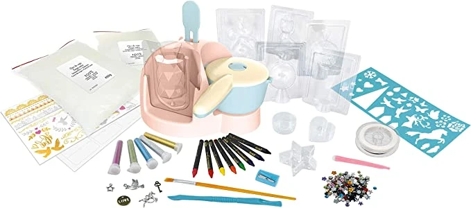 Obsah súpravy: 6 veľkých priehľadných foriem, 3 formy na čajové sviečky, bavlnený knôt, 2 balenia sójového vosku (2x 450g), 8 voskových pasteliek, 1 strúhadlo, 1 štetec, 5 tub s trblietkami, 5 príveskov, nástroje na opracovanie.