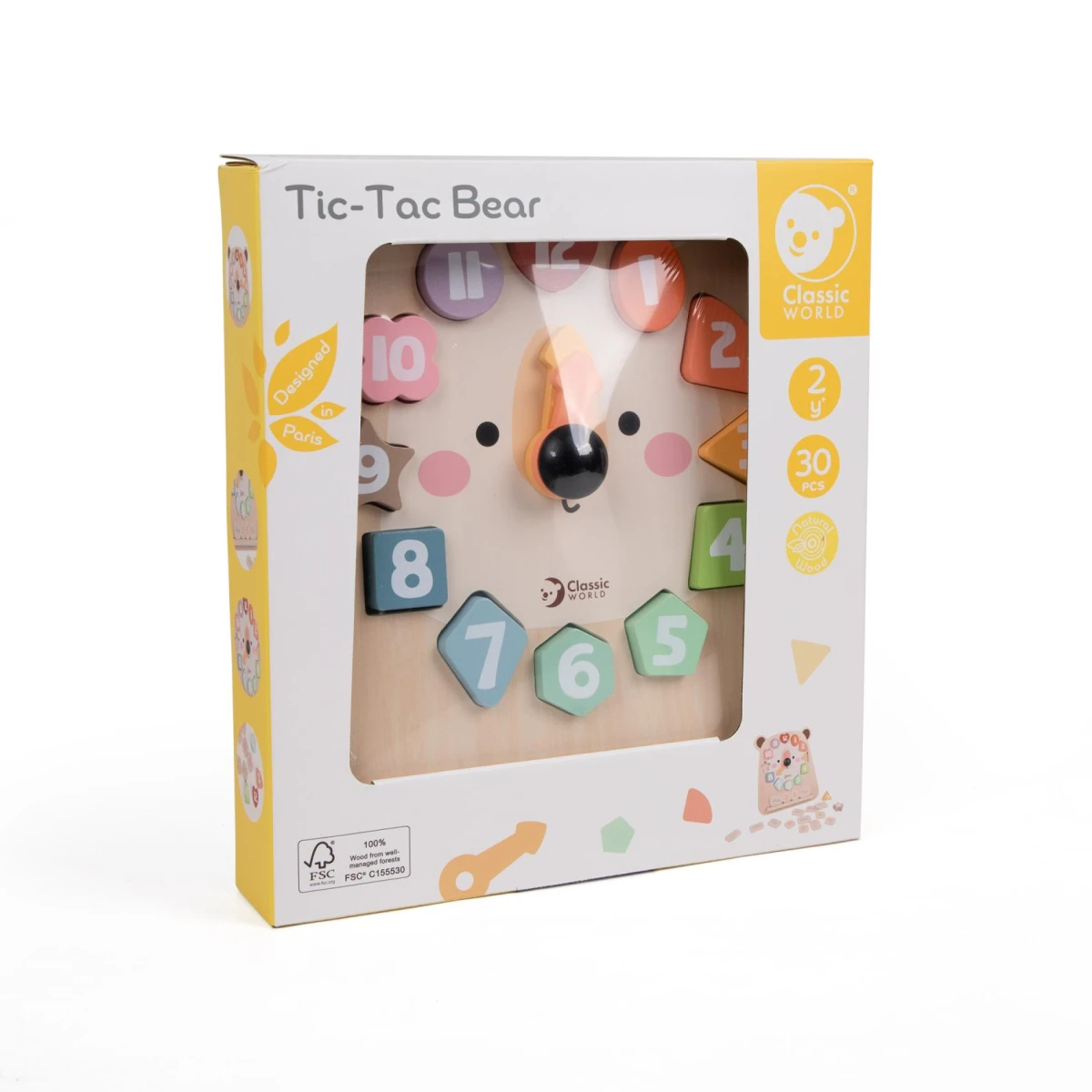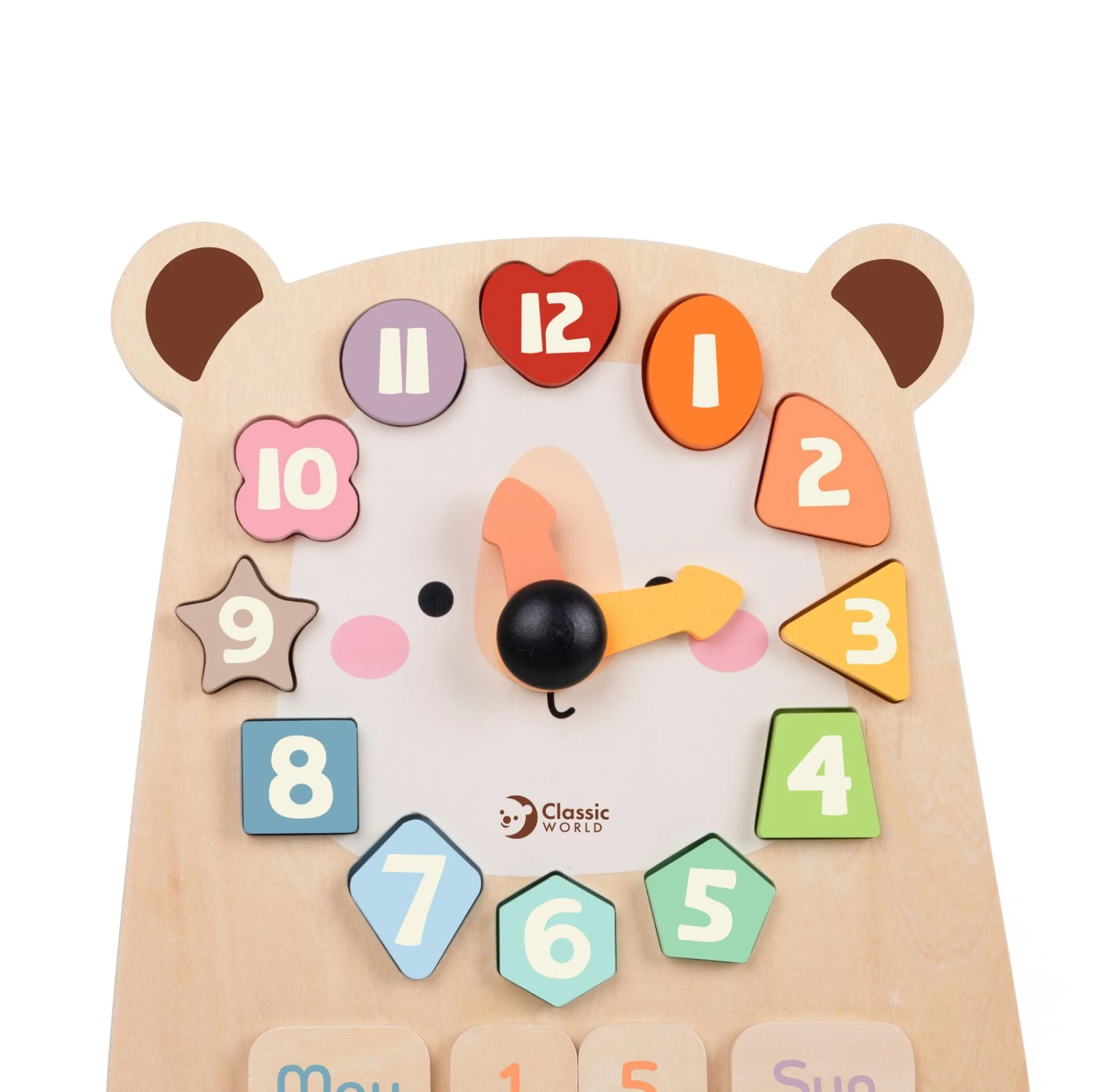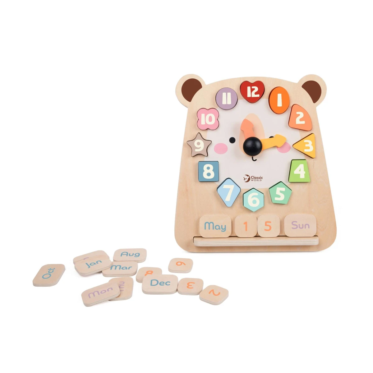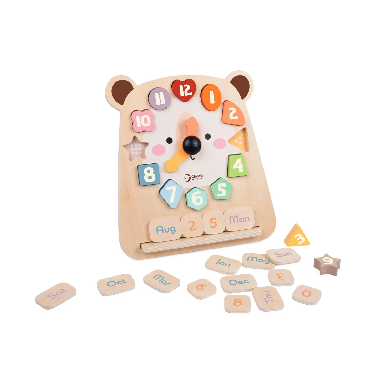 Roztomilé drevené hodiny s motívom medveďa pomáhajú deťom zábavnou formou naučiť sa poznávať čas.