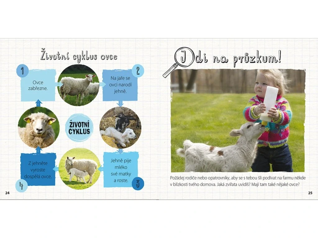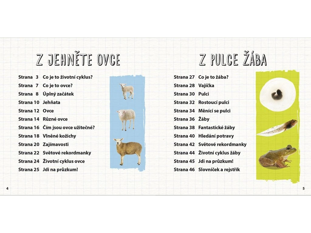 Počas rastu, dospievania a starnutia prechádzajú ľudia, zvieratá aj rastliny určitými rozdielnymi fázami. Hovorí sa tomu prírodné cykly, cykly života... Priučte sa o tom, ako prebieha život živočíchov a rastlín, ktoré človek stretne v prírode alebo využíva v poľnohospodárstve. V tomto zväzku nájdete konkrétne životné cykly dvoch živočíchov: ovce a žaby. Od jahnite cez prvé strihanie vlny po vlastné mláďatá; od žubrienky cez žabinec po rekordy z žabie ríše. Informatívne texty sa ľahko čítajú a prehľadné znázornenia napomáhajú pochopeniu danej problematiky. Vďaka tomu sa táto knižná séria bude páčiť predovšetkým mladým čitateľom, ktorí sa chcú dozvedieť viac o svete, ktorý ich obklopuje.