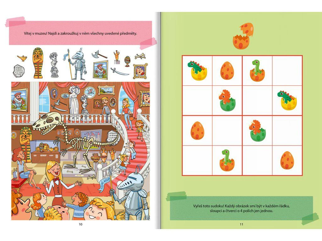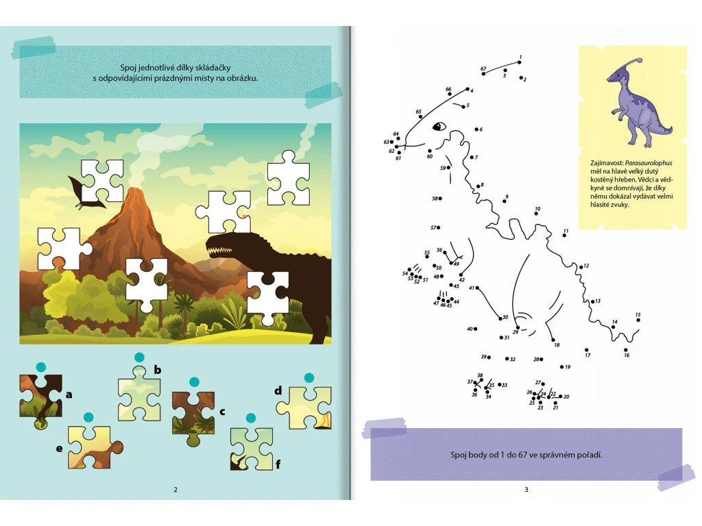 V tomto zošite so zábavnými aktivitami z pravekej ríše si deti užijú veľa zábavy. Na odvážnych a skúsených lúštiteľov a lúštiteľov tu čaká spájanie bodov s číslami, hľadanie rozdielov, riešenie sudoku či prechádzanie bludiskom. Riešte najrôznejšie úlohy a úlohy a zistite o niektorých dinosauroch aj pár zaujímavostí. Viete, čo je to skamenelina, na čo ankylosaury používali chvost a aké veľké mali tyranosaury zuby? Pripravte si ceruzky a pastelky a pustite sa do riešenia týchto zložitejších aktivít!